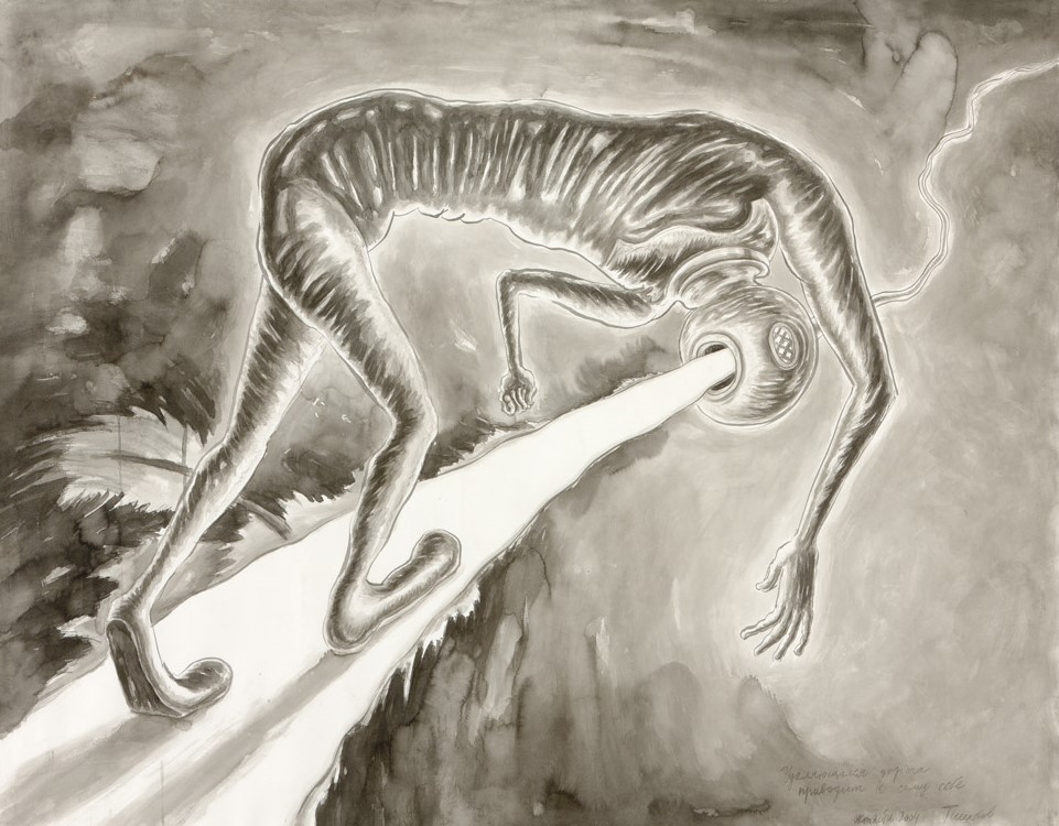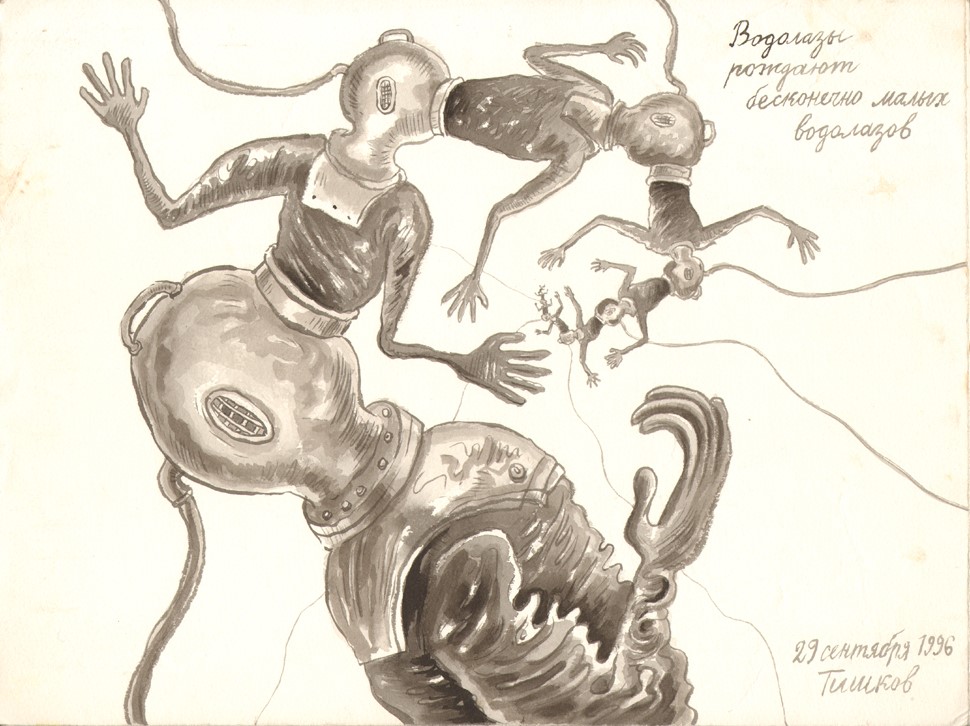 Leonid Tishkov. Deep Sea Divers Procreating Infinitely Small Deep Sea Divers. From the Deep Sea Divers series. 1996. Indian ink on paper. 28x37 cm.