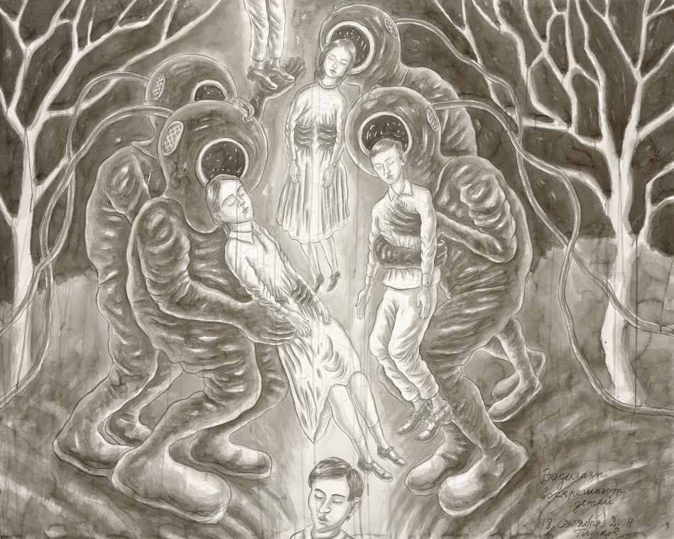 Leonid Tishkov. Deep Sea Divers resurrect children. 2004. Indian ink on paper. 120x152 cm.