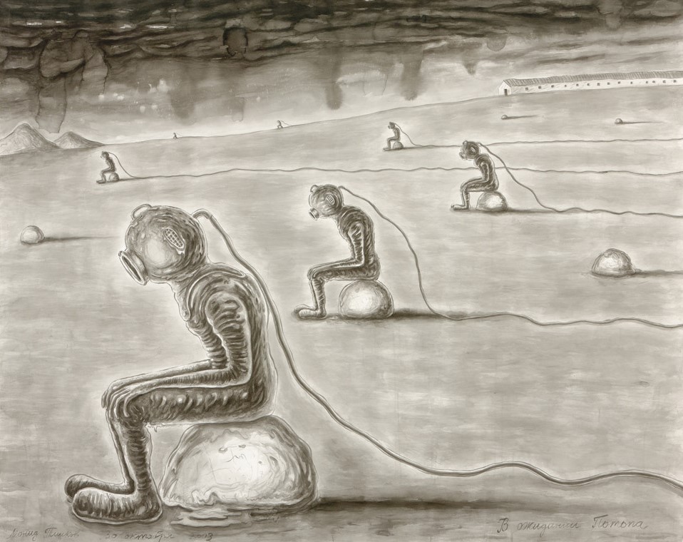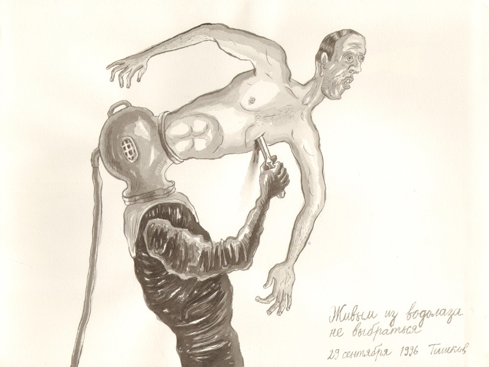 Leonid Tishkov. No One Can Get Out of a Deep Sea Diver Alive. From the Deep Sea Divers series. 1996. Indian ink on paper. 27.5x36.5 cm.
