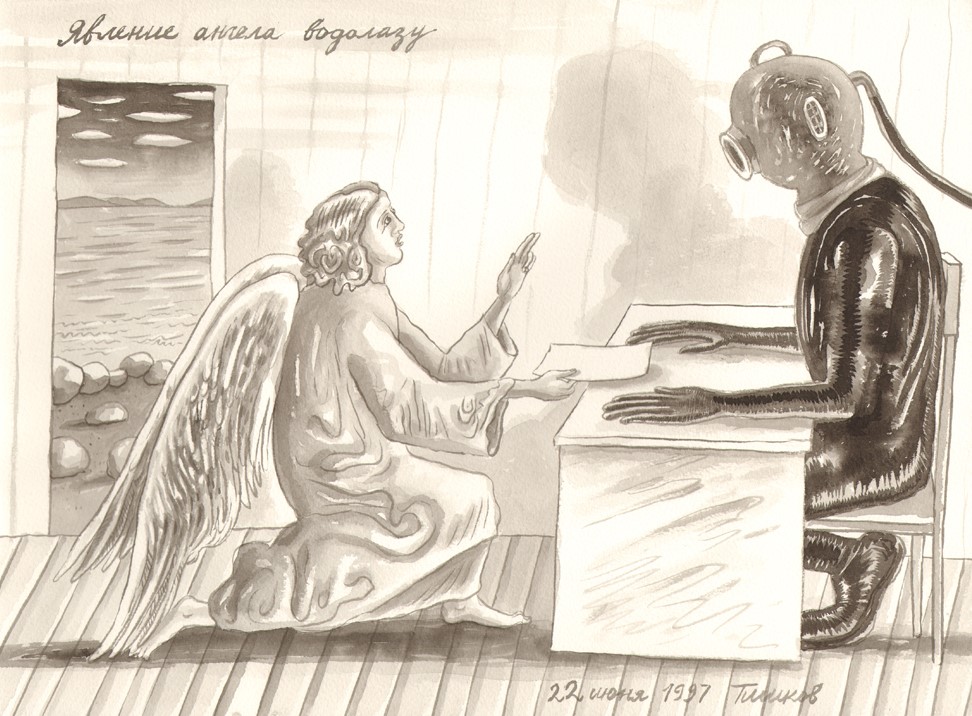 Leonid Tishkov. Visitation of a Deep Sea Diver by an Angel. From the Deep Sea Divers series. 1997. Indian ink on paper. 28x38 cm.