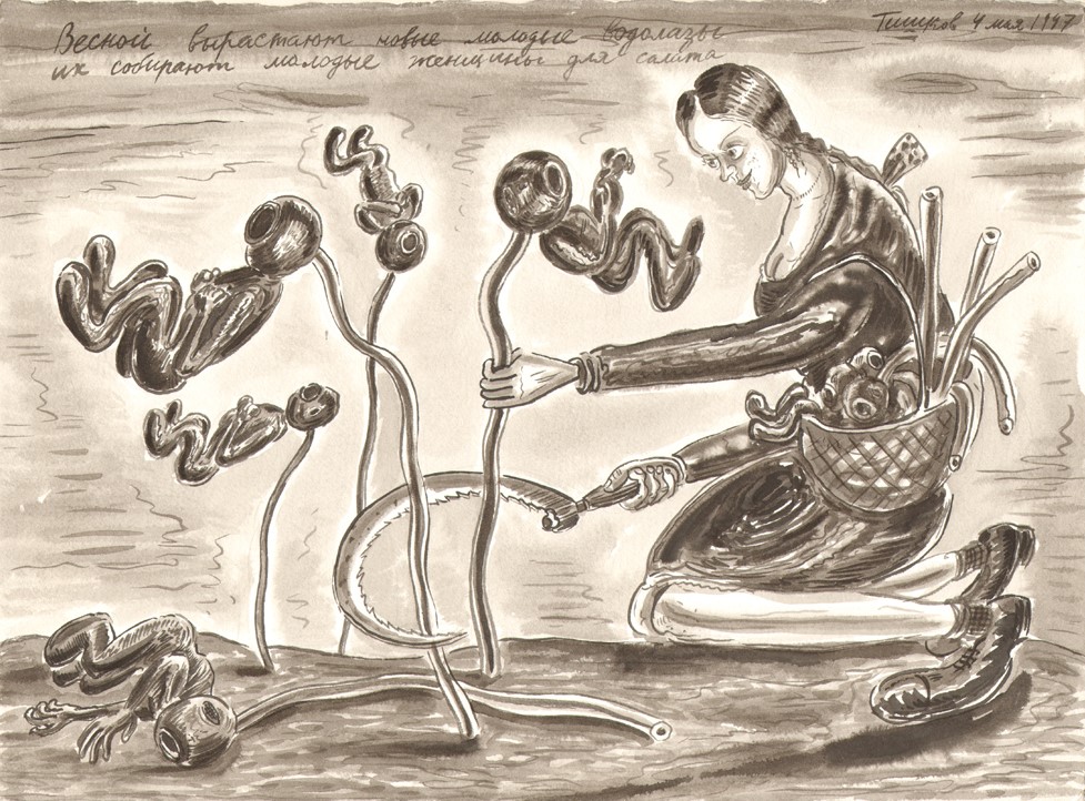 Leonid Tishkov. New, Young Deep Sea Divers Sprout Forth Every Spring, and Young Women Pick Them up for Salad. From the Deep Sea Divers series. 1997. Indian ink on paper. 27.7x37.7 cm.