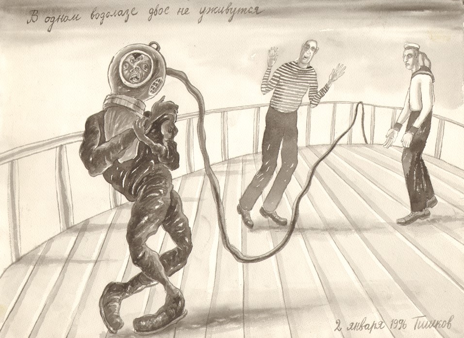 Leonid Tishkov. Two Can't Get Along in One Deep Sea Diver. From the Deep Sea Divers series. 1996. Indian ink on paper. 27.4x37.3 cm.