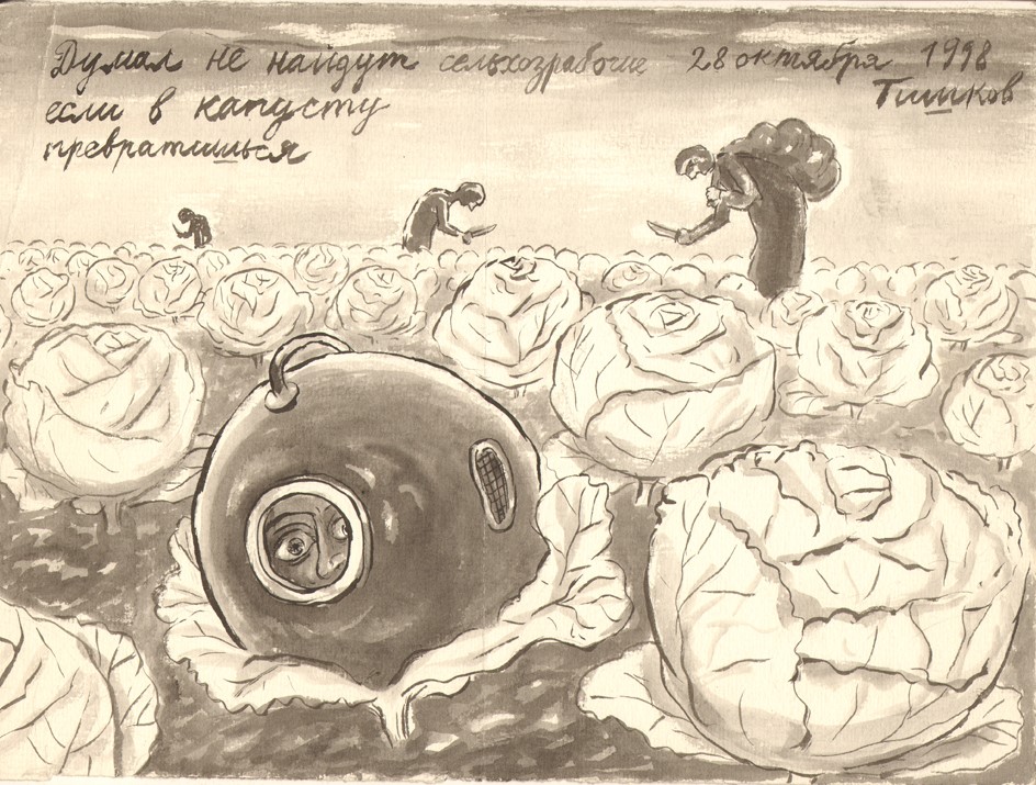 Leonid Tishkov. He Thought Farm Workers won't Find Him if He Turns into a Cabbage. From the Deep Sea Divers series. 1998. Indian ink on paper. 25x33.8 cm.