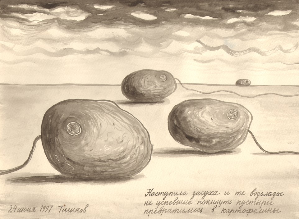 Leonid Tishkov. The Dry Season Arrived, and the Deep Sea Divers Who Didn't Manage to Leave the Wastelands in Time, Turned Into Potatoes. From the Deep Sea Divers series. 1997. Indian ink on paper. 27.5x37.5 cm.