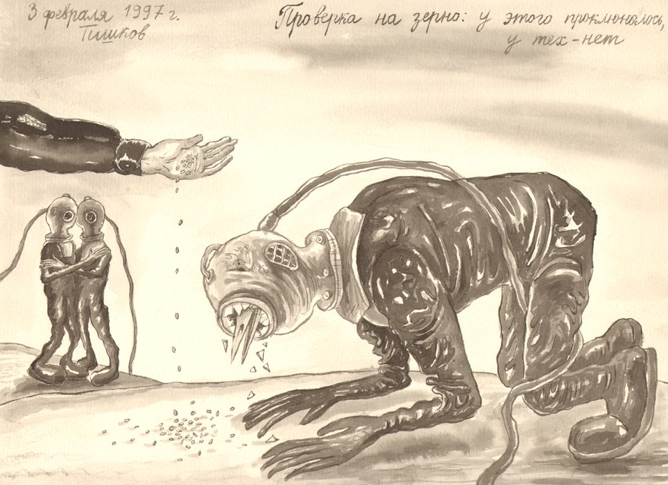 Leonid Tishkov. The Grain Test: This One Proved Positive, the Others Didn't. From the Deep Sea Divers series. 1997. Indian ink on paper. 27.5x37.5 cm.