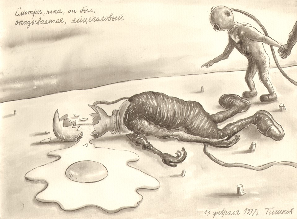 Leonid Tishkov. Look, Dad, He Turned Out to be Egg-Headed! From the Deep Sea Divers series. 1997. Indian ink on paper. 27.5x37.3 cm.