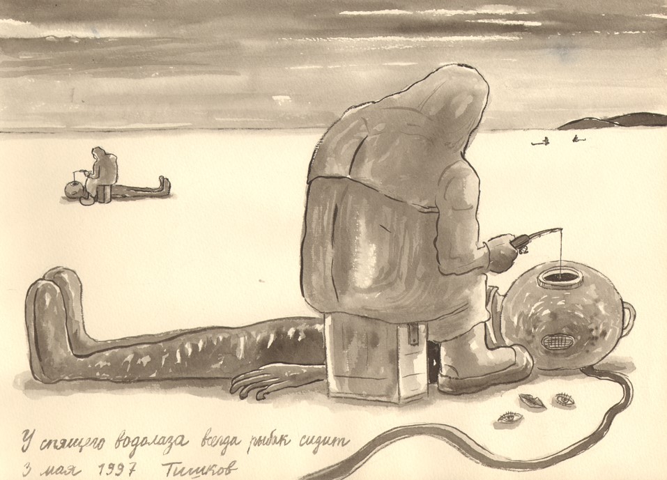 Leonid Tishkov. You'll Always Find a Fisherman Sitting at a Sleeping Deep Sea Diver. From the Deep Sea Divers series. 1997. Indian ink on paper. 27.5x38 cm.