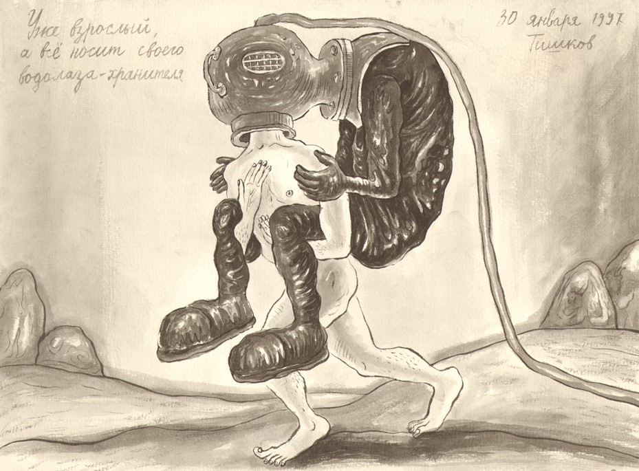 Leonid Tishkov. Has Grown So Big Already, but Still Carries Around his Guardian Deep Sea Diver. From the Deep Sea Divers series. 1997. Indian ink on paper. 27.5x37.3 cm.