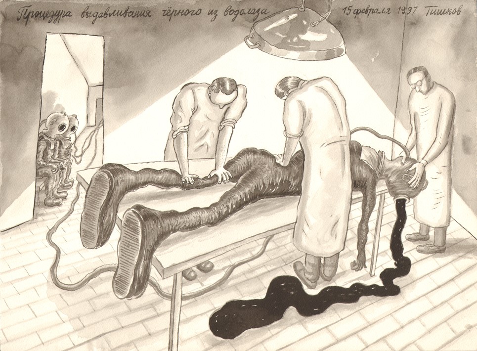 Leonid Tishkov. The Procedure of Squeezing the Black out of a Deep Sea Diver. From the Deep Sea Divers series. 1997. Indian ink on paper. 27.4x37.3 cm.