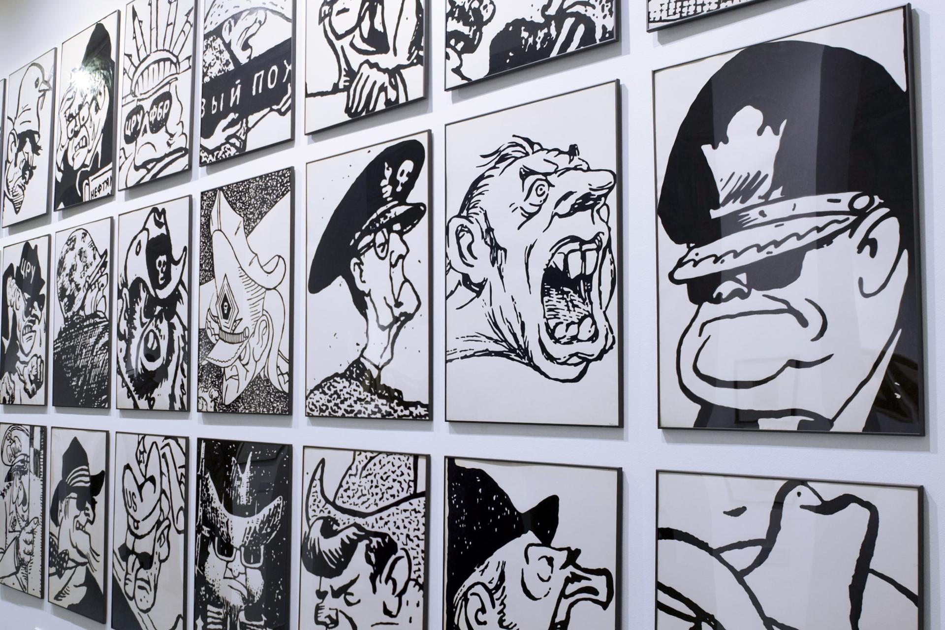 The second series (Americans as Seen by a Russian) reproduces in an enlarged form some fragments of Soviet caricatures demonstrating “the bared teeth of imperialism”. As the images speak for themselves, they carry no captions. Bakhchanyan employed a “non-waste” method of converting propagandist expressions into artistic ones, “working” here on his viewers’ minds solely by form: the line, the contrast of black and white, the mere scale.