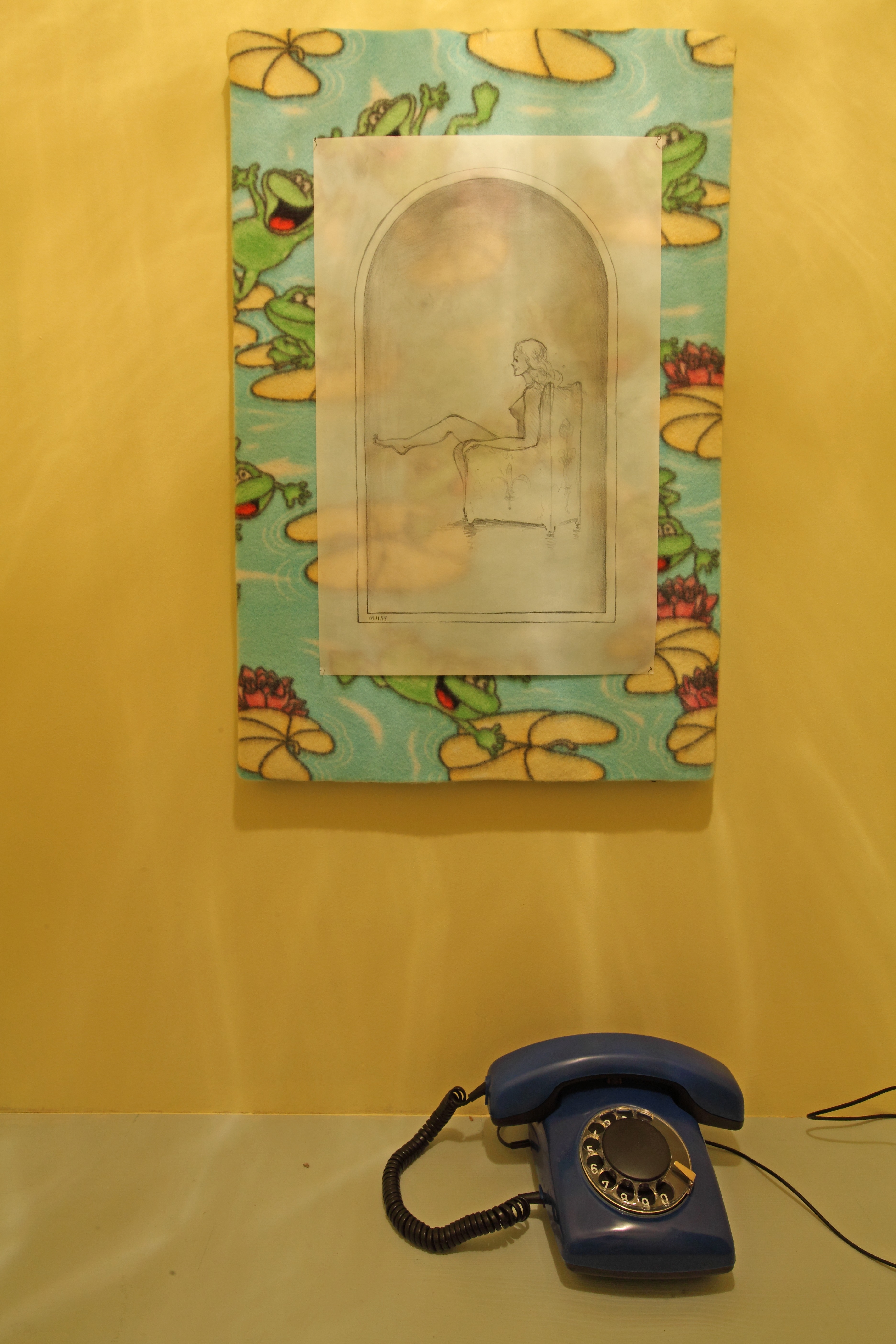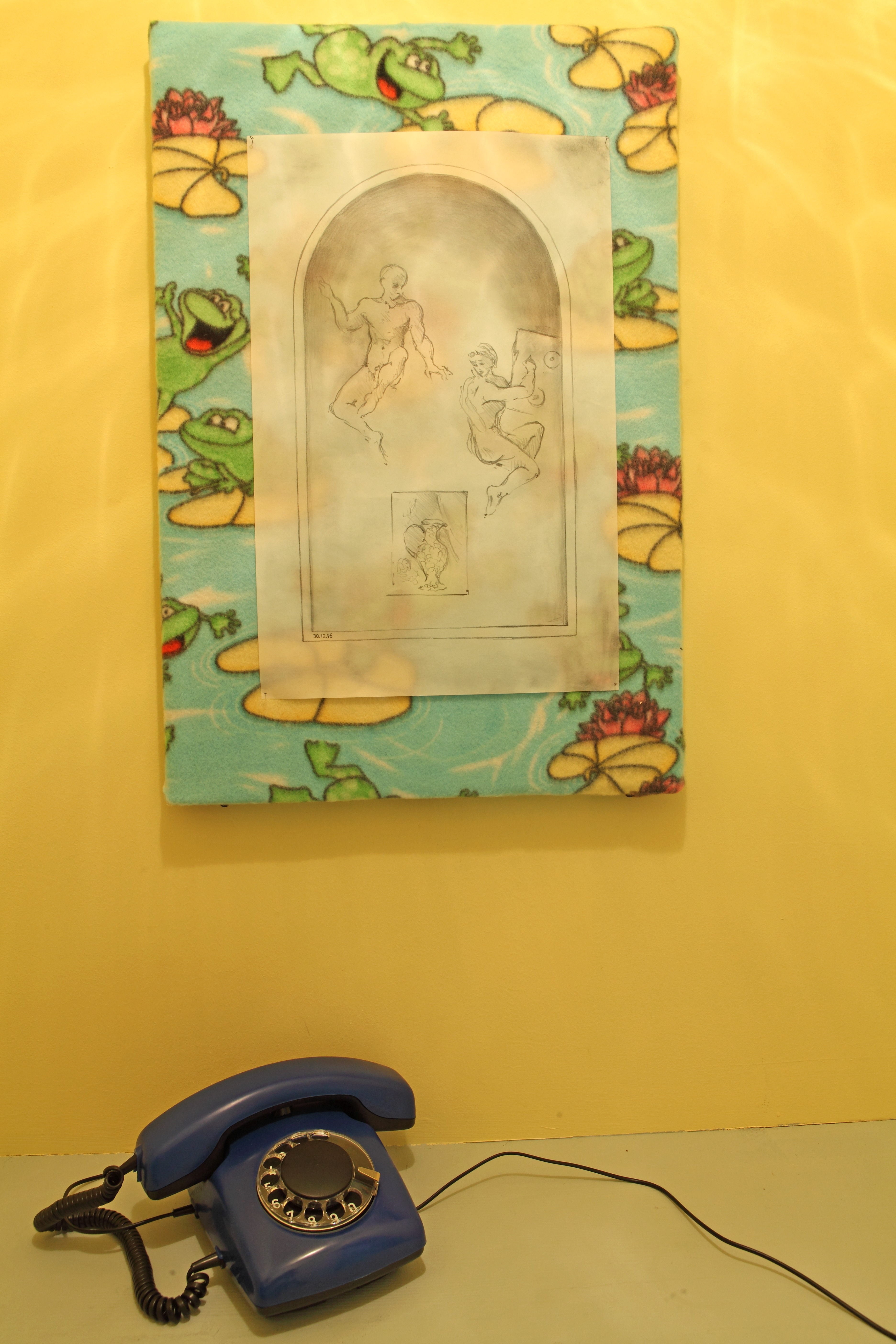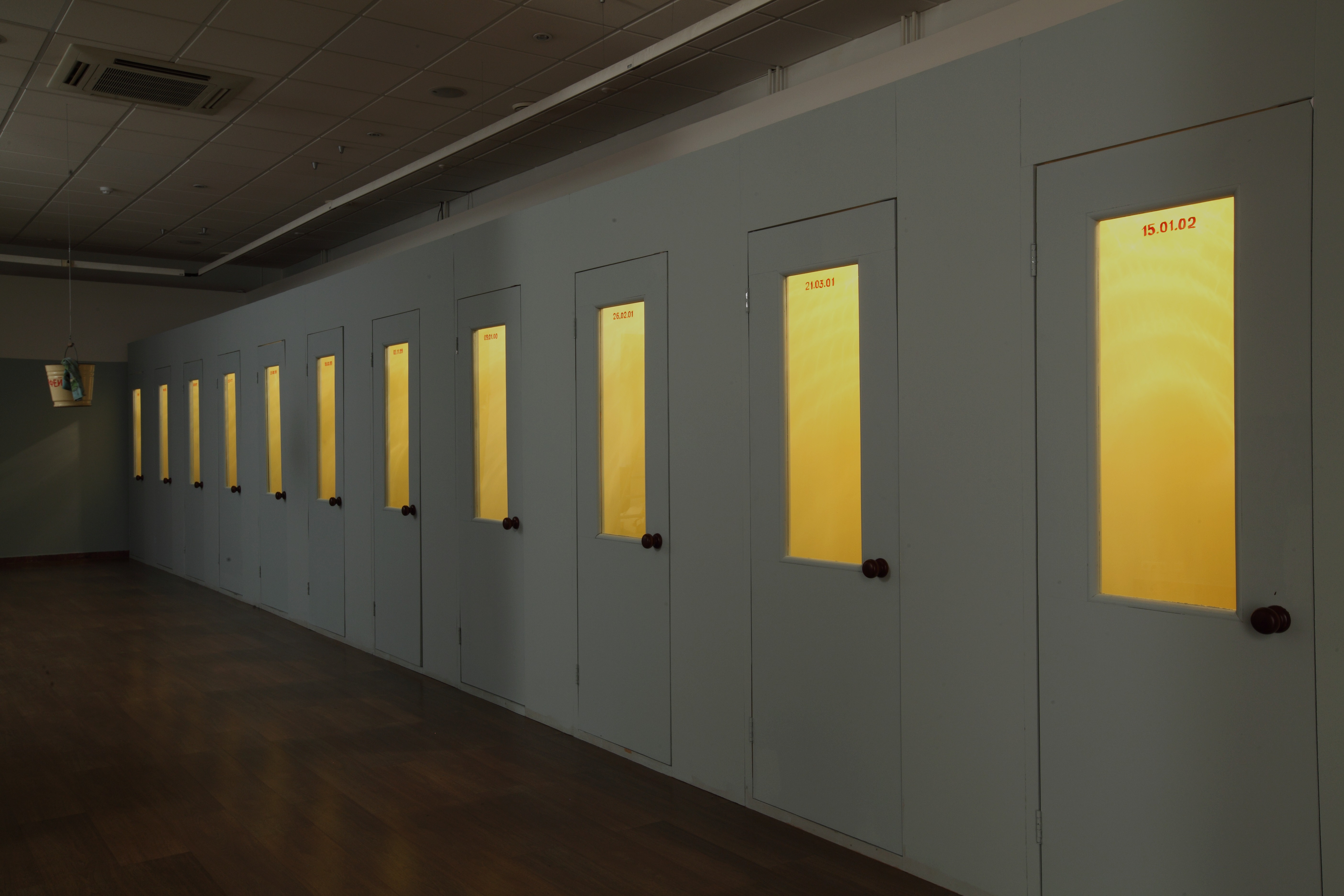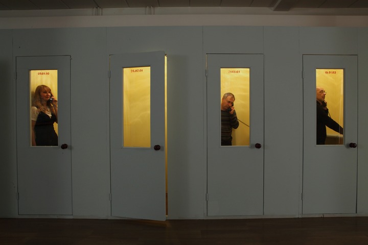 This installation by the Cupidon group consists of three exhibits of differing scale. The first — the spatial nucleus of the installation — is a row of thirteen cubicles, imitating a Soviet-era public office for long-distance phone calls. Each of the cubicles is devoted to a dream and the abbreviation of the dream is marked on its door. Upon entering the cubicle, the viewer sees a drawing-illustration by Victor Skersis to Albert’s dream, and he can then pick up a telephone receiver and hear Albert’s voice recounting the dream.