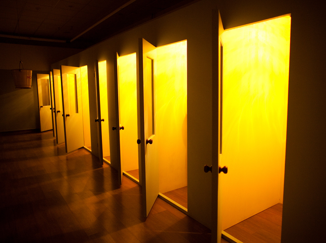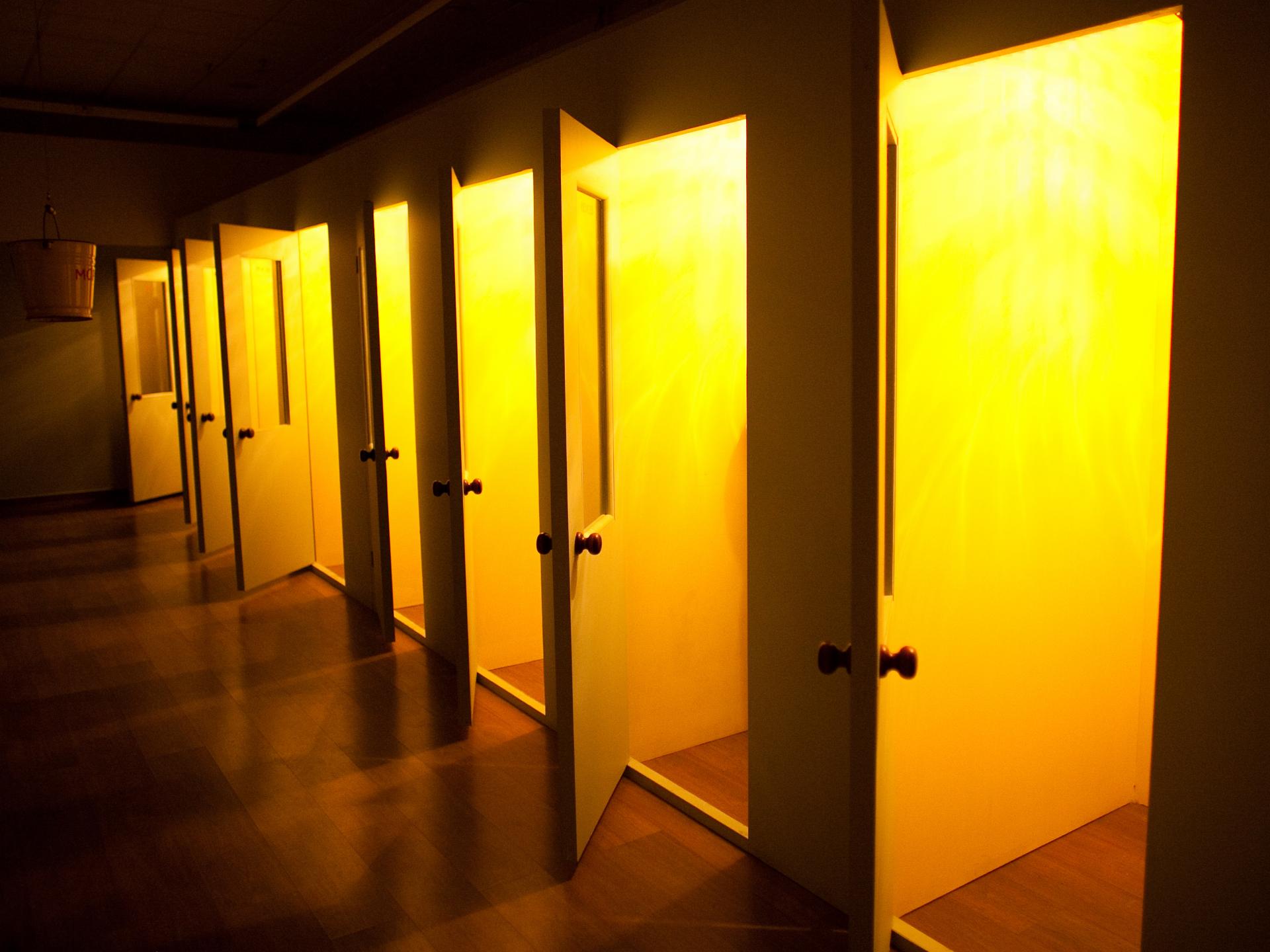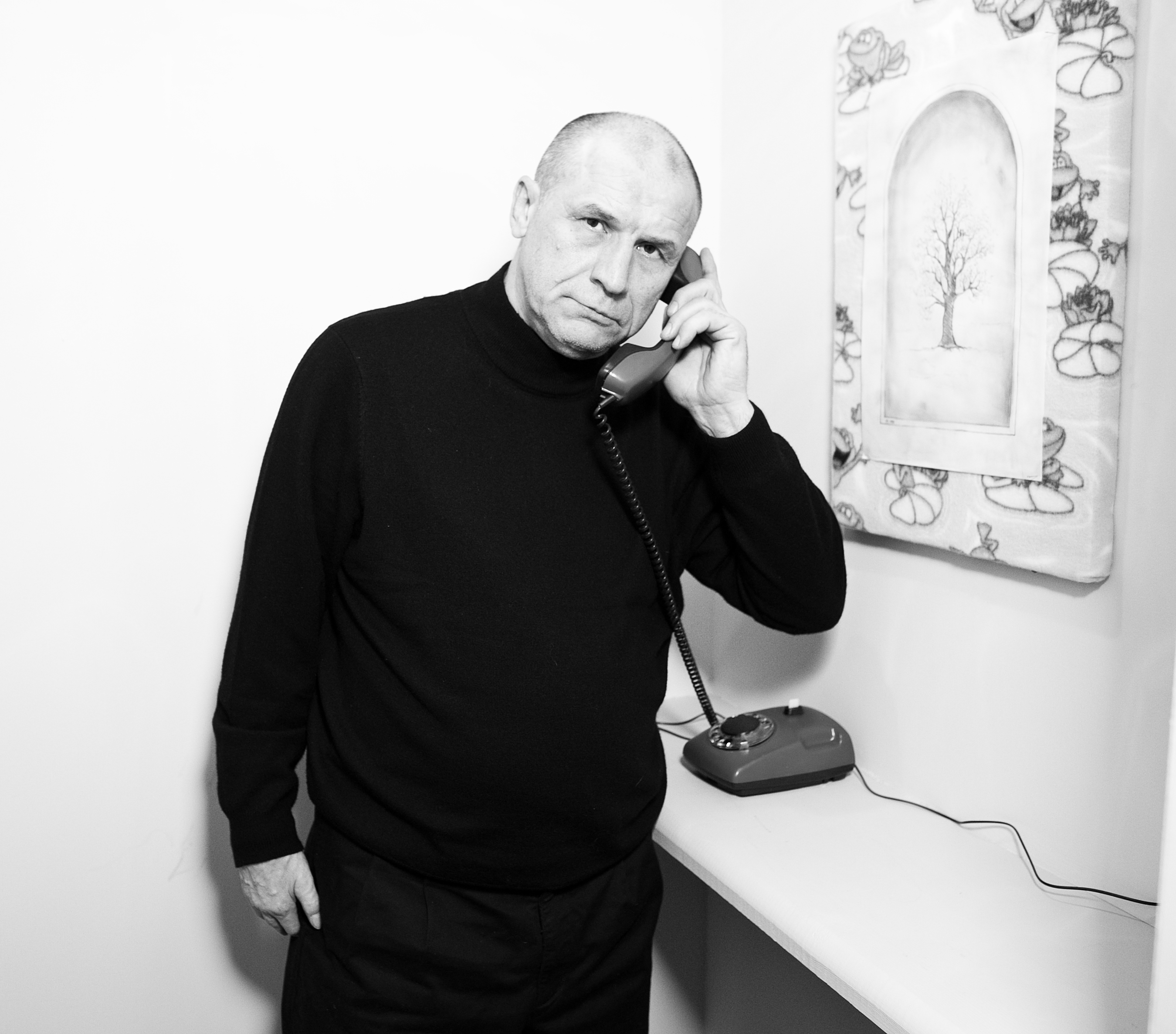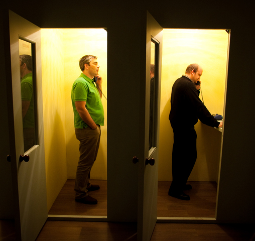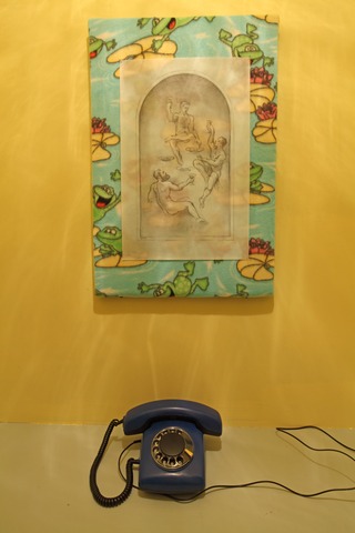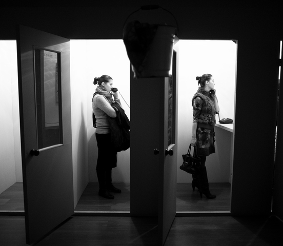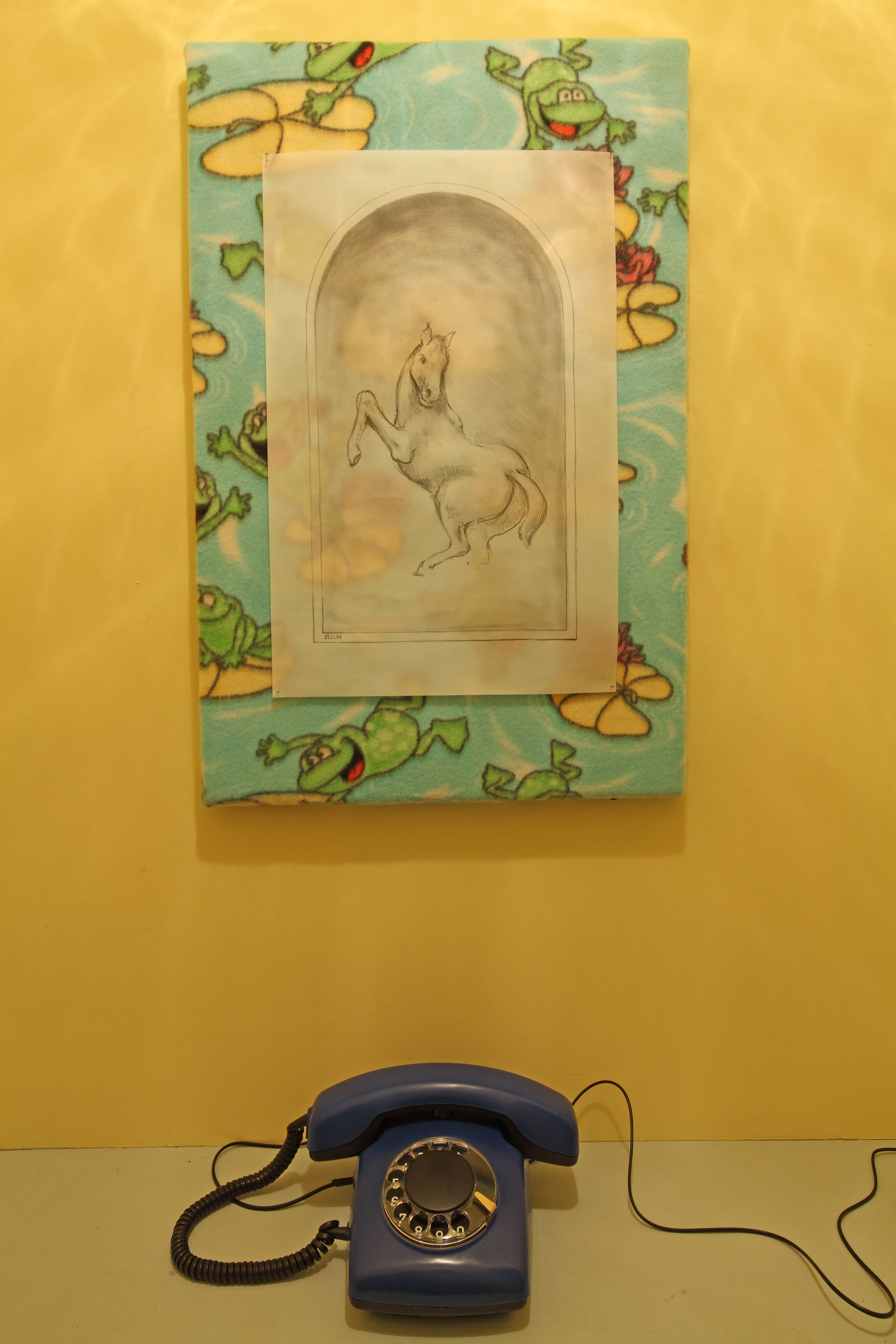 This installation by the Cupidon group consists of three exhibits of differing scale. The first — the spatial nucleus of the installation — is a row of thirteen cubicles, imitating a Soviet-era public office for long-distance phone calls. Each of the cubicles is devoted to a dream and the abbreviation of the dream is marked on its door. Upon entering the cubicle, the viewer sees a drawing-illustration by Victor Skersis to Albert’s dream, and he can then pick up a telephone receiver and hear Albert’s voice recounting the dream.
