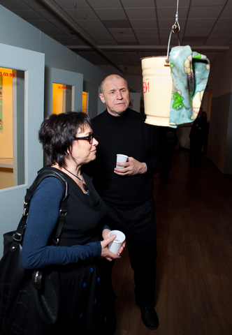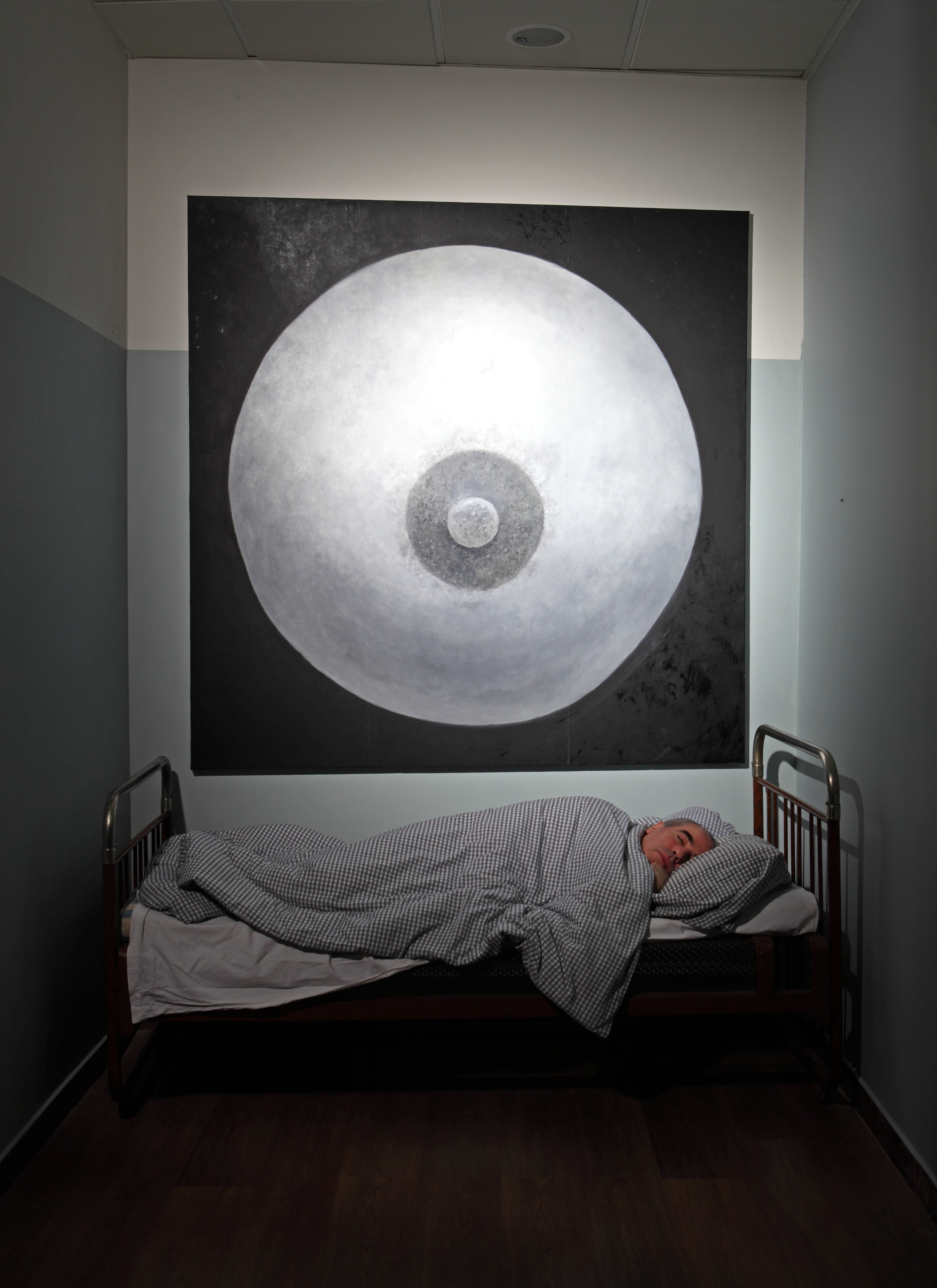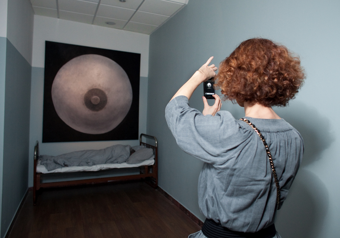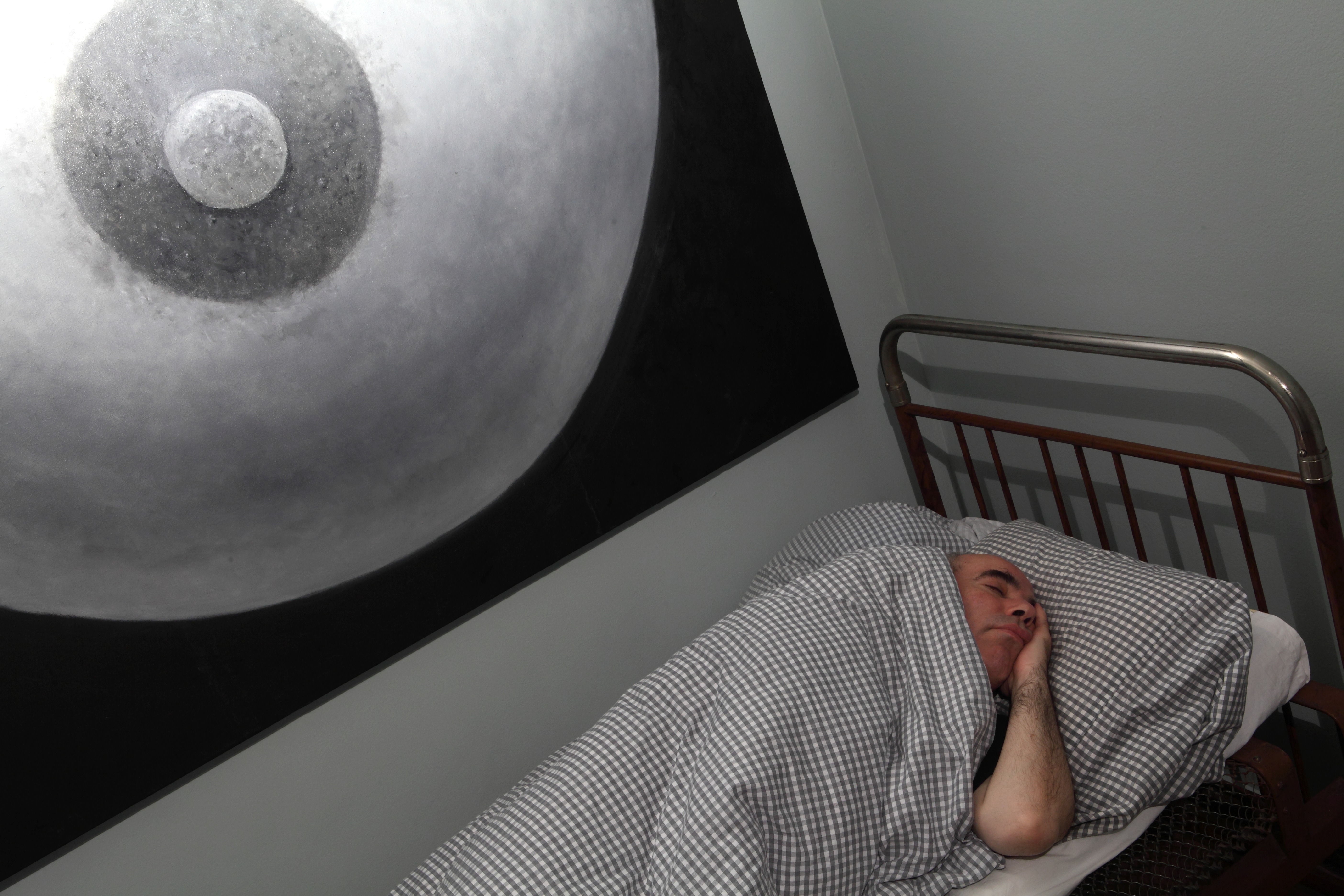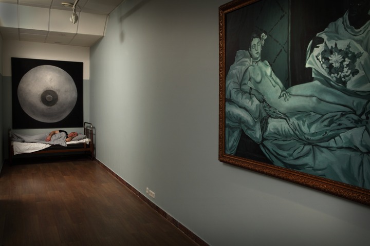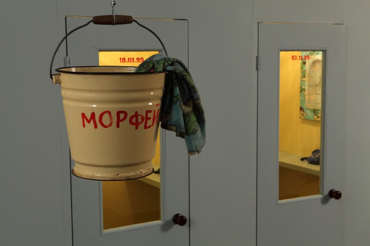 Meanwhile the second exhibition object, or rather subject-personality — the artist Yuri Albert — will sleep peacefully next to the cubicles in an old bed from his country house. It should be noted that he only sleeps at the private view. The rest of the time this exhibit consists of the bed alone, which somewhat changes the intonation of the project.