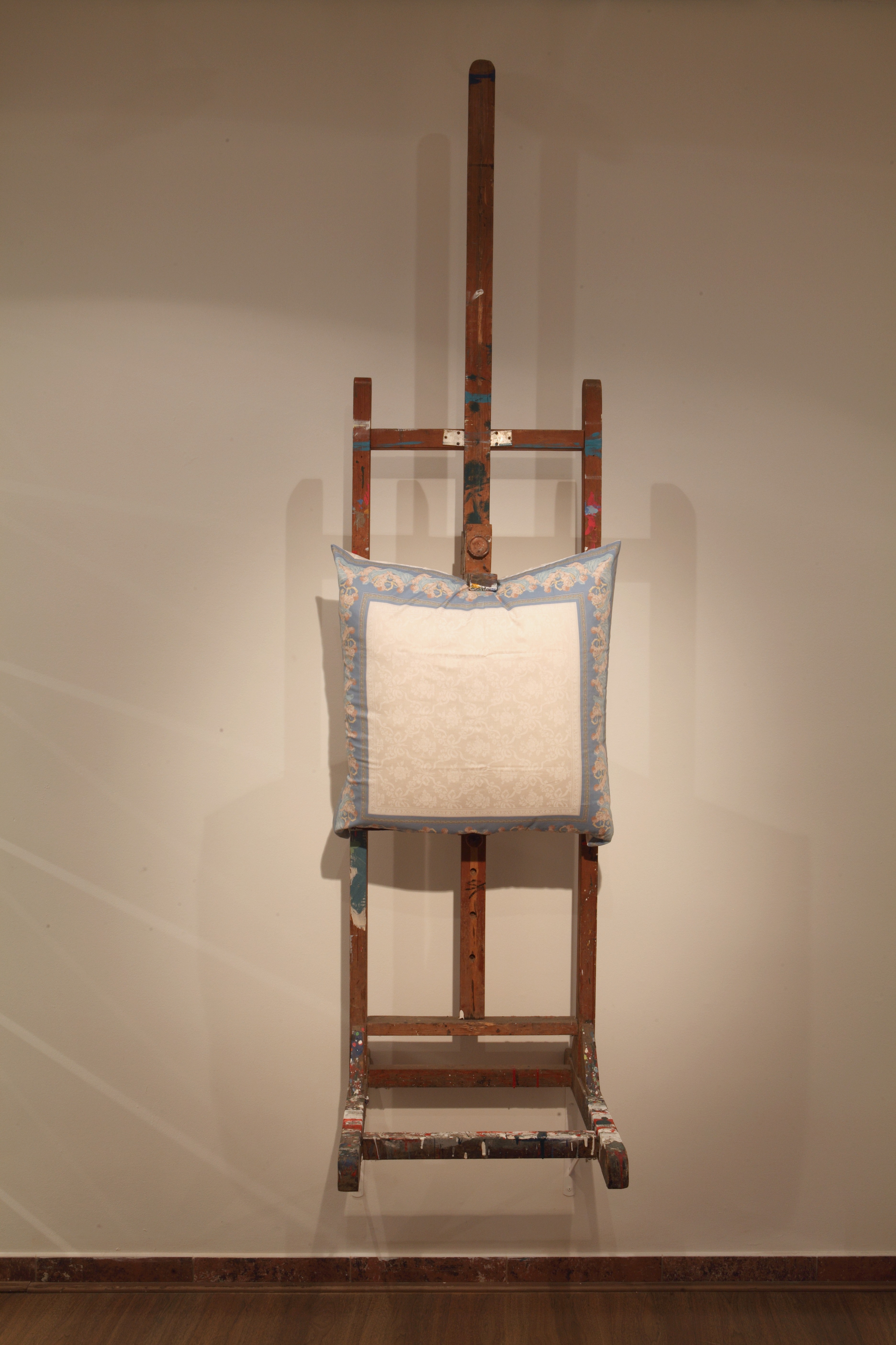 Finally, the third object is an old stainless-steel bucket of water, on which the name of the exhibition is roughly inscribed. It hangs from the ceiling of the next room at the level of the viewer’s knees, obstructing the passage to offices. The water in the bucket might be intended for waking up from the dream, and thereby mark the spatial border of the installation. If so, the inscription — “Metamorpheus” — is a sign of such awakening. Or of a false awakening, which turns out to be the next dream.