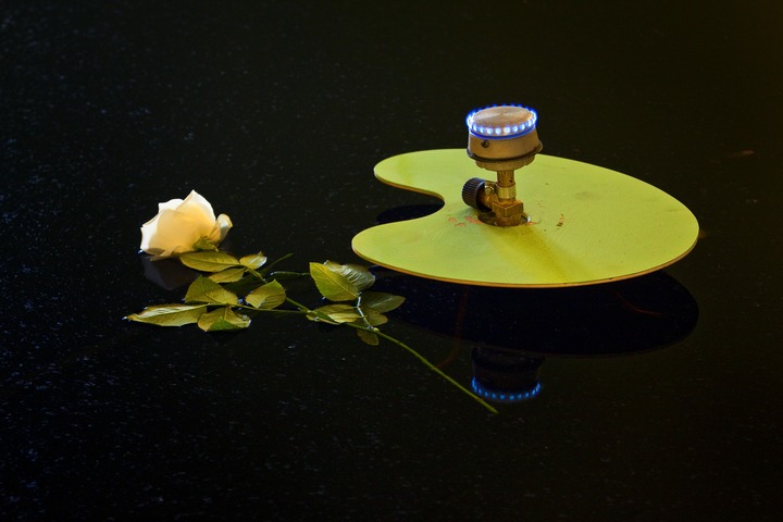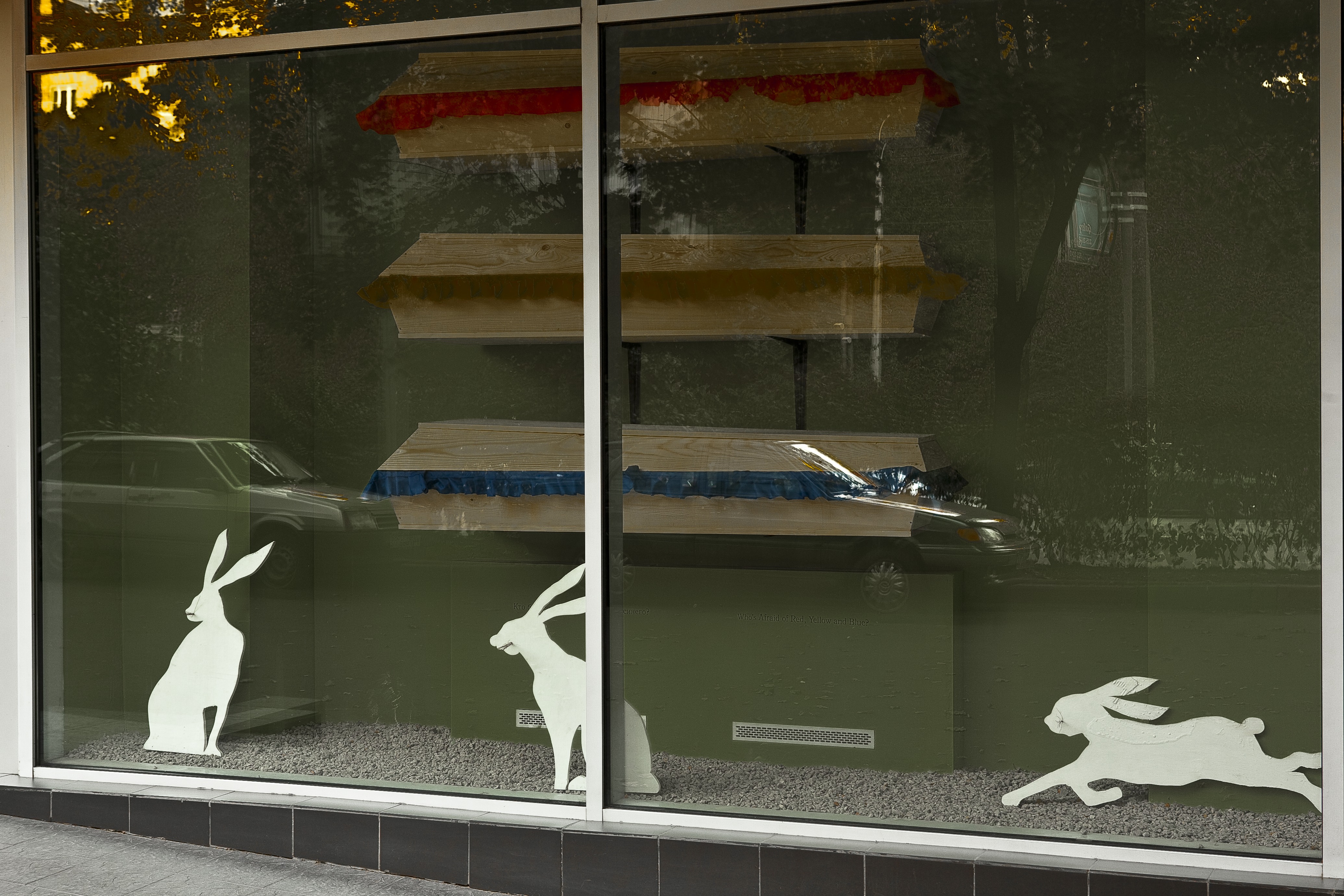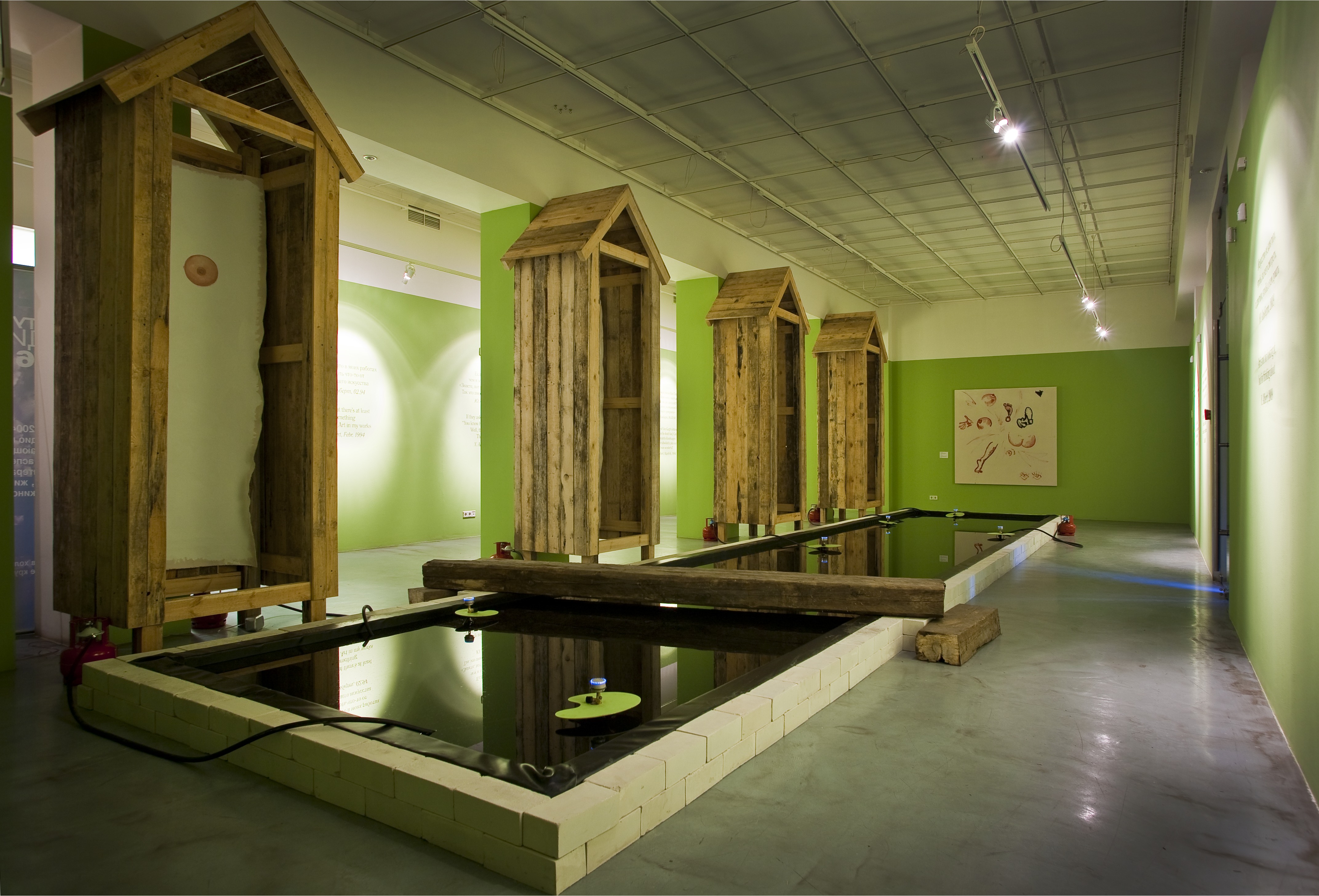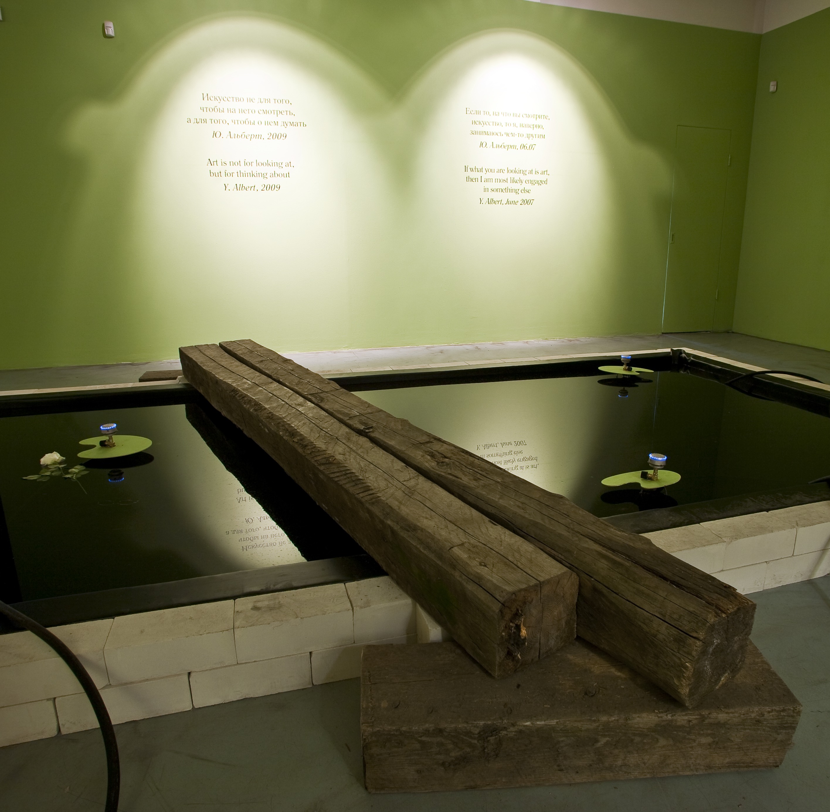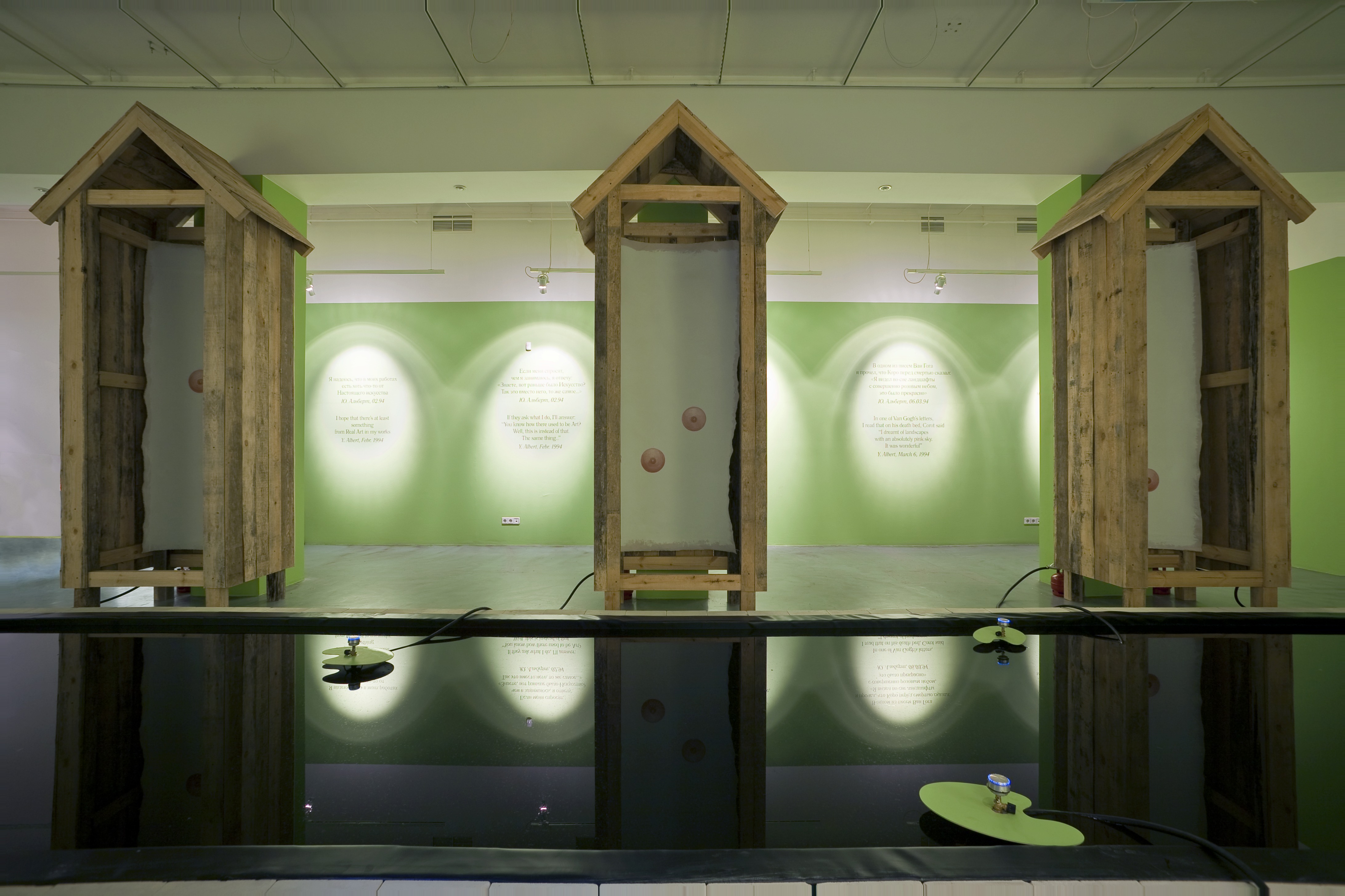 The resulting product is an installation where each individual system interacts with other systems in an unpredictable way, transforming itself, much like a theme in a jazz improvisation. Textual pieces by Yuri Albert, dealing, as always, with his own oeuvre, act as a backdrop to Victor Skersis’ monumental “confessionary cabins”. The cabins are placed along the edge of the “infernal pool” by Andrey Filippov (a homage to the Water Lilies cycle by Claude Monet, his last work before his death). The latter piece creates an association with the three coffins appearing in the exhibition hall’s showcase, another work by Yuri Albert (Who’s Afraid of Red, Yellow and Blue?) citing masterpieces by Alexander Rodchenko, Barnett Newman, etc.
