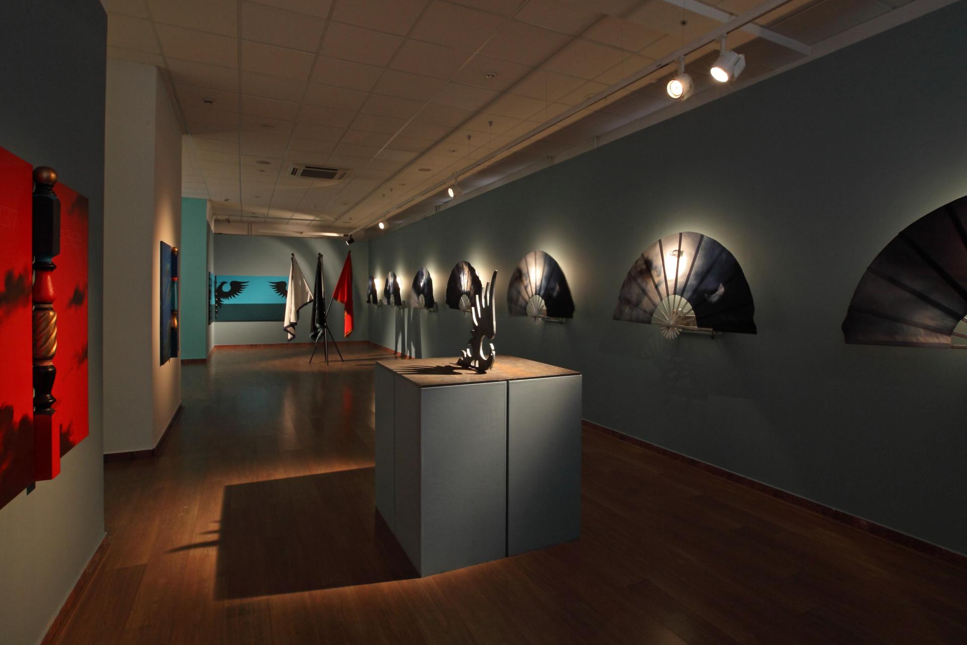 Each part of the Triptych includes a group exhibition and a solo exhibition by one member of the co-op. On this occasion it is the turn of Andrei Filippov. For his exhibition he has created a sum of varied works, in which the central place is taken by electro-dynamic objects — closing and opening fans with a representation of the sky. Behind each fan there is a luminous disc, on which the hand of an angel has been painted holding a scroll: the disc is seen at the moment when the fan begins to close. The whole installation is entitled Rolling Blackout.