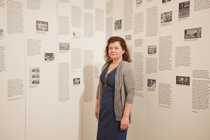 A structural element of the work is the archive entitled: Alternative Currencies. An Archive and a Manifesto. Through images, texts and videos it visualises examples of non-monetary exchange systems. Focusing on historical and contemporary applications of alternative social experiments, such as a system of cash transfer using pre-paid mobile phone minutes that is evolving as a form of alternative currency in parts of Africa, the archive stands as a clear political statement which questions the homogenizing power of a single currency.