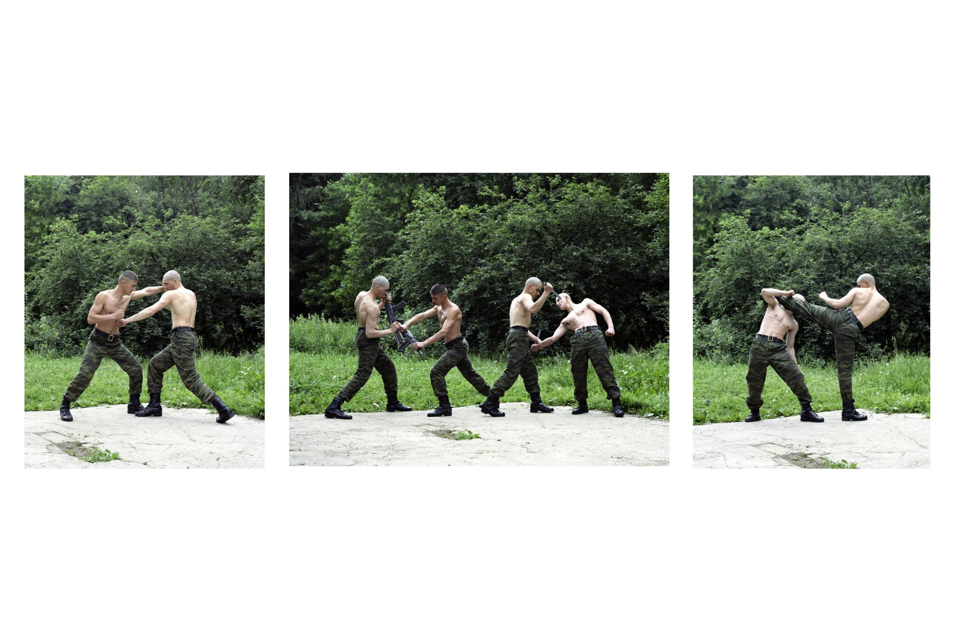 Anastasia Khoroshilova based her new project on her own photographic pictures of Russian soldiers demonstrating hand-to-hand combat techniques. There are five separate images and two large triptychs. Objective filming style, natural light and colour, a tactfully unassuming title. The project is free both from pacifistically critical and neo-imperial overtones. It has its own pathos, to be sure, but of a different kind.