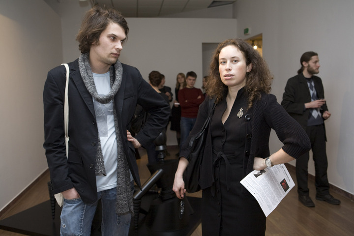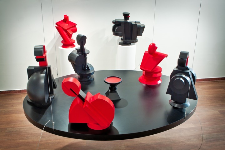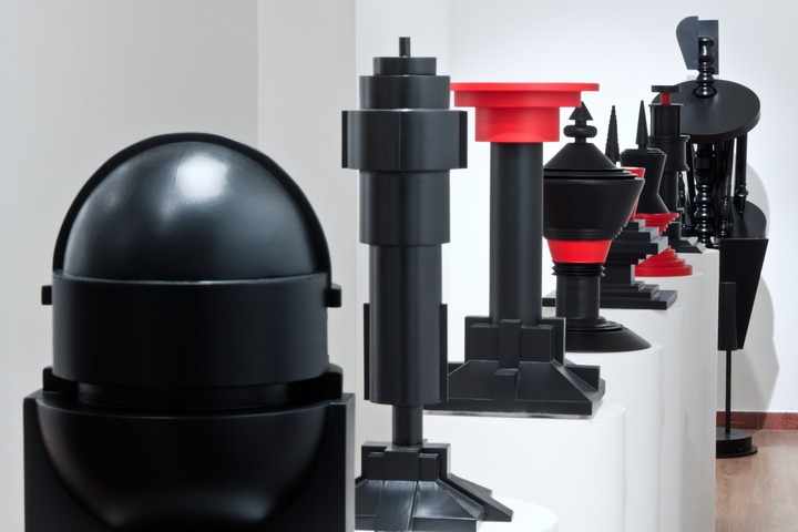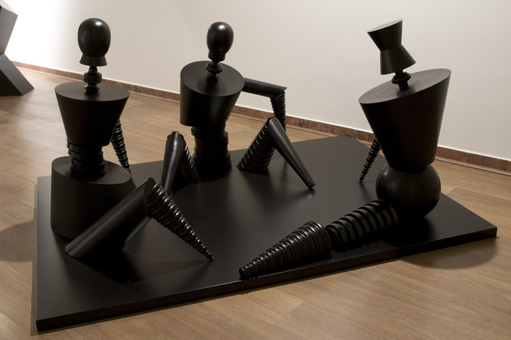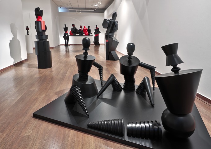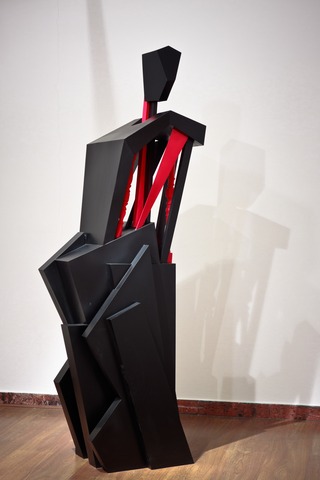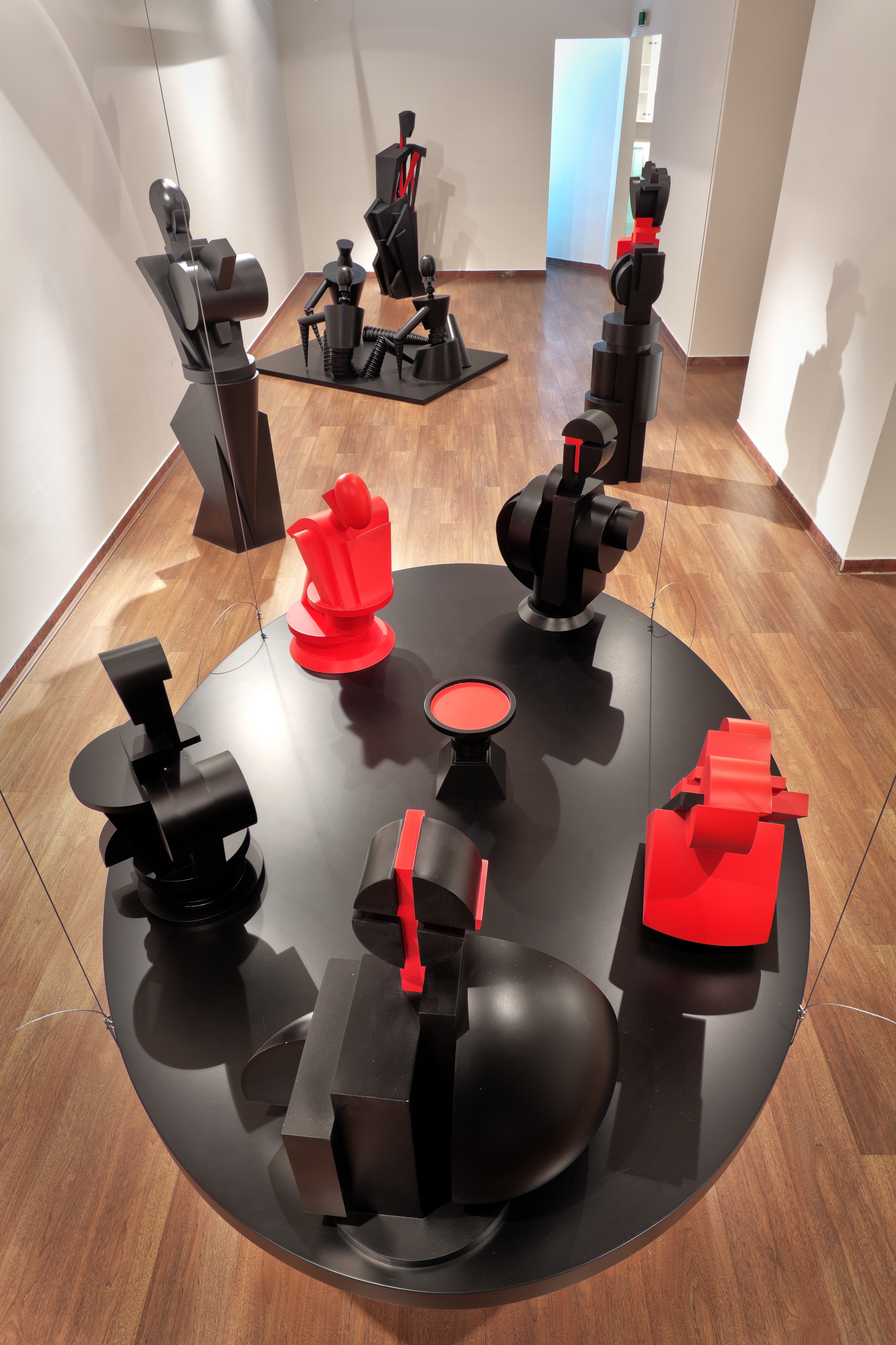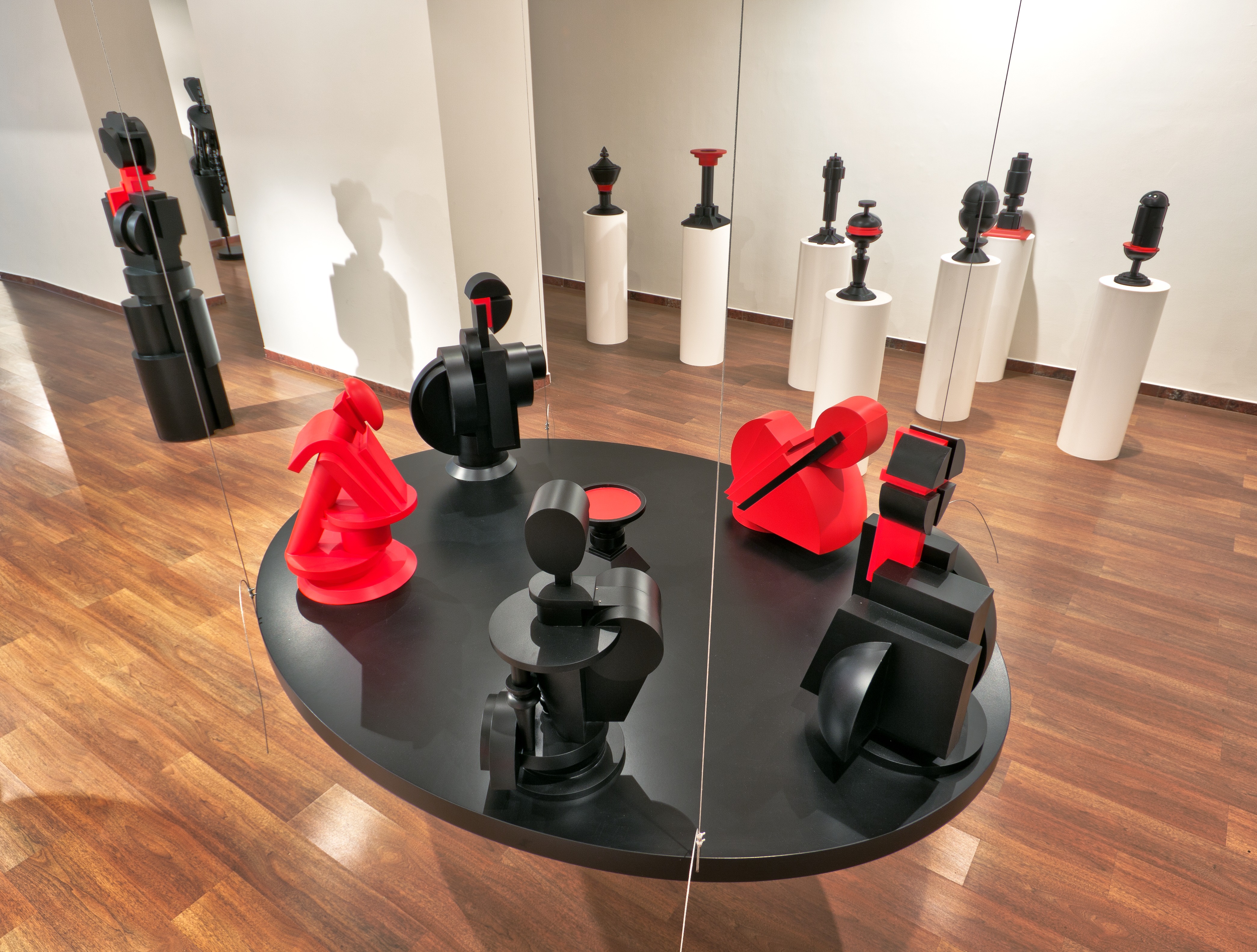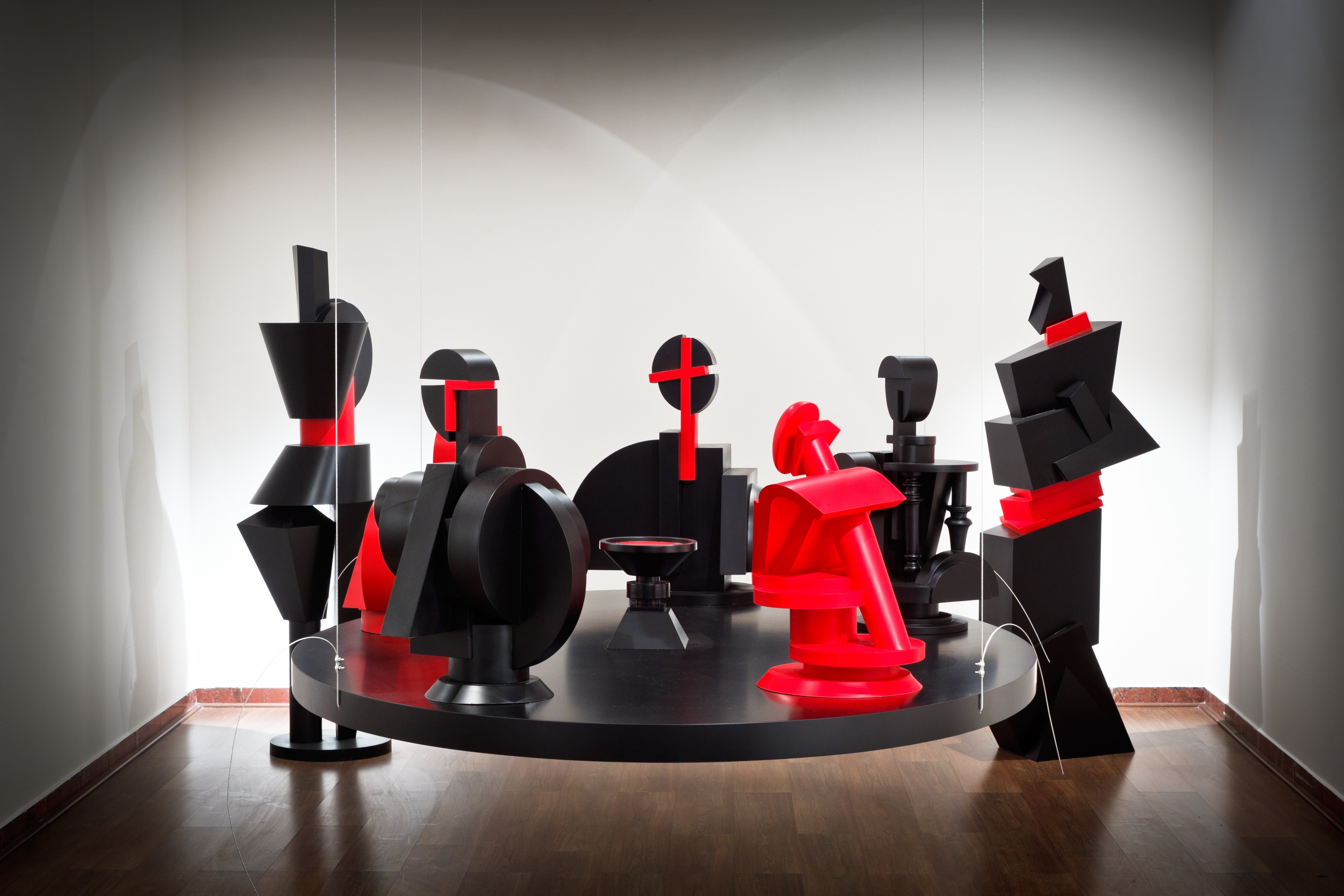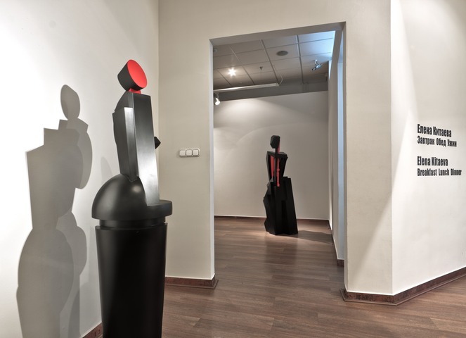 Faithful to the Suprematist canon, to which the number three is fundamental, Elena Kitaeva constructs her multi-figured sculptural composition as the tryptich Breakfast. Lunch. Dinner. The artist likewise works only with three entirely suprematist colors: red, white, and black. For Kitaeva, as for Malevich, white signifies the world space (in our case the white cube of the exhibition hall) in which the drama of black and red is played out. Kitaeva’s figures are painted in these colors and numbered by powers of three. Breakfast has three figures, Dinner nine, and Lunch 12, not counting the nine figures of the “watchmen” guarding the territory occupied by the three main compositions.