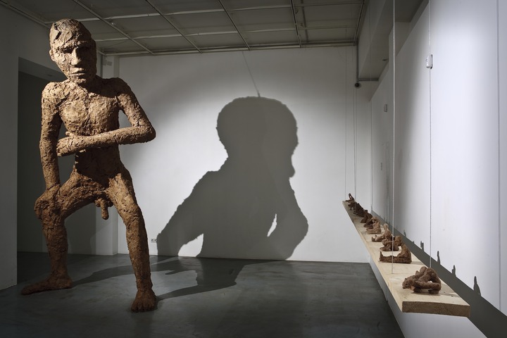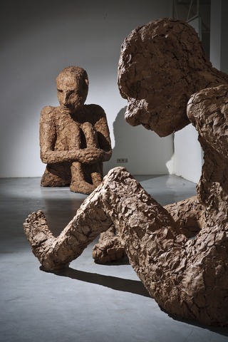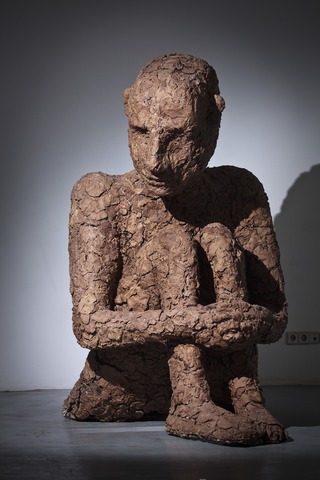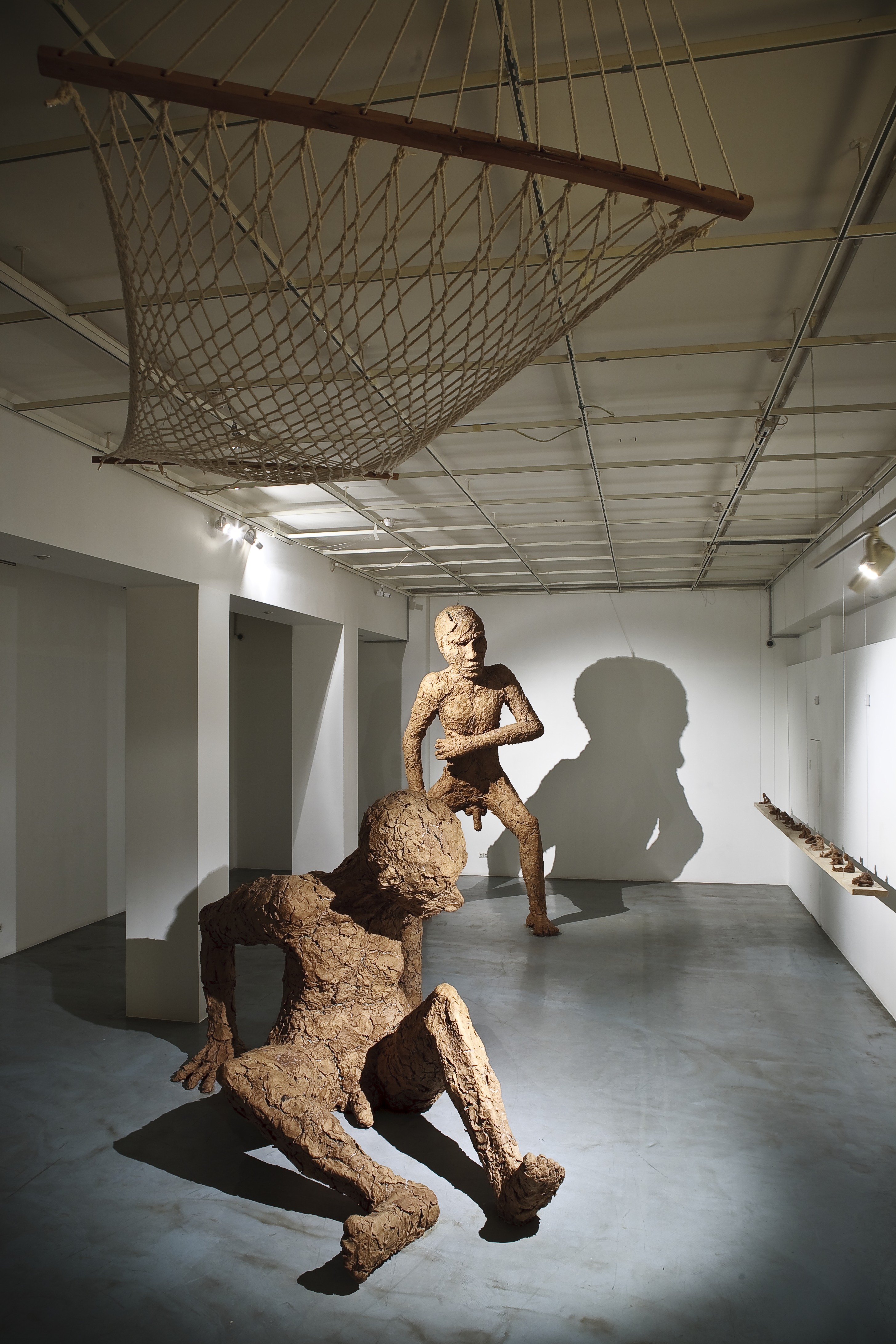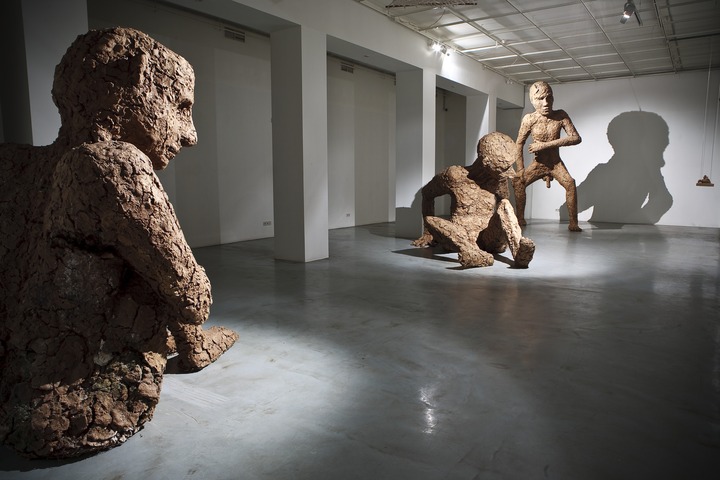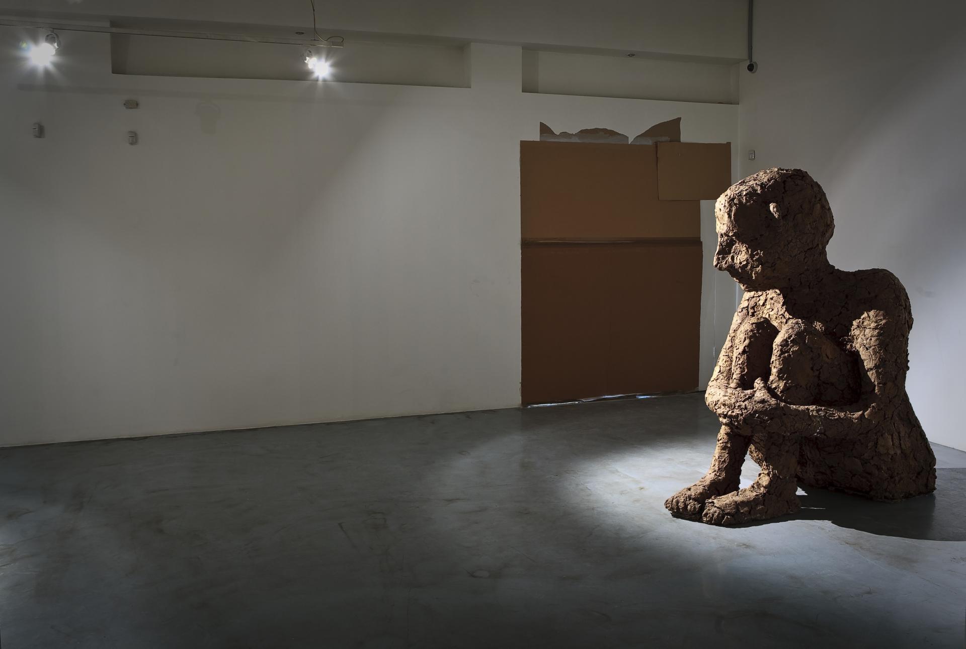 “Three naked male figures with disproportionately huge heads, modelled roughly out of an undefined grey-brownish substance. They are so enormous that they are incapable of handling their own size and weight. Their spasmodic gestures are evidence of their lack of the most basic skills needed for survival. And one can hardly fight the impression that they were only born yesterday, even though their bodies are already on the verge of disintegration. These creatures dominate the space of the exhibition so much that it seems like a toy house, in which their bodies are both transitory and inappropriate. Or maybe, hints the same intuition, they only appear this way in the tunnel of our own routinely ruined perception. Whereas in reality their place is somewhere else, somewhere where this perception cannot reach”.