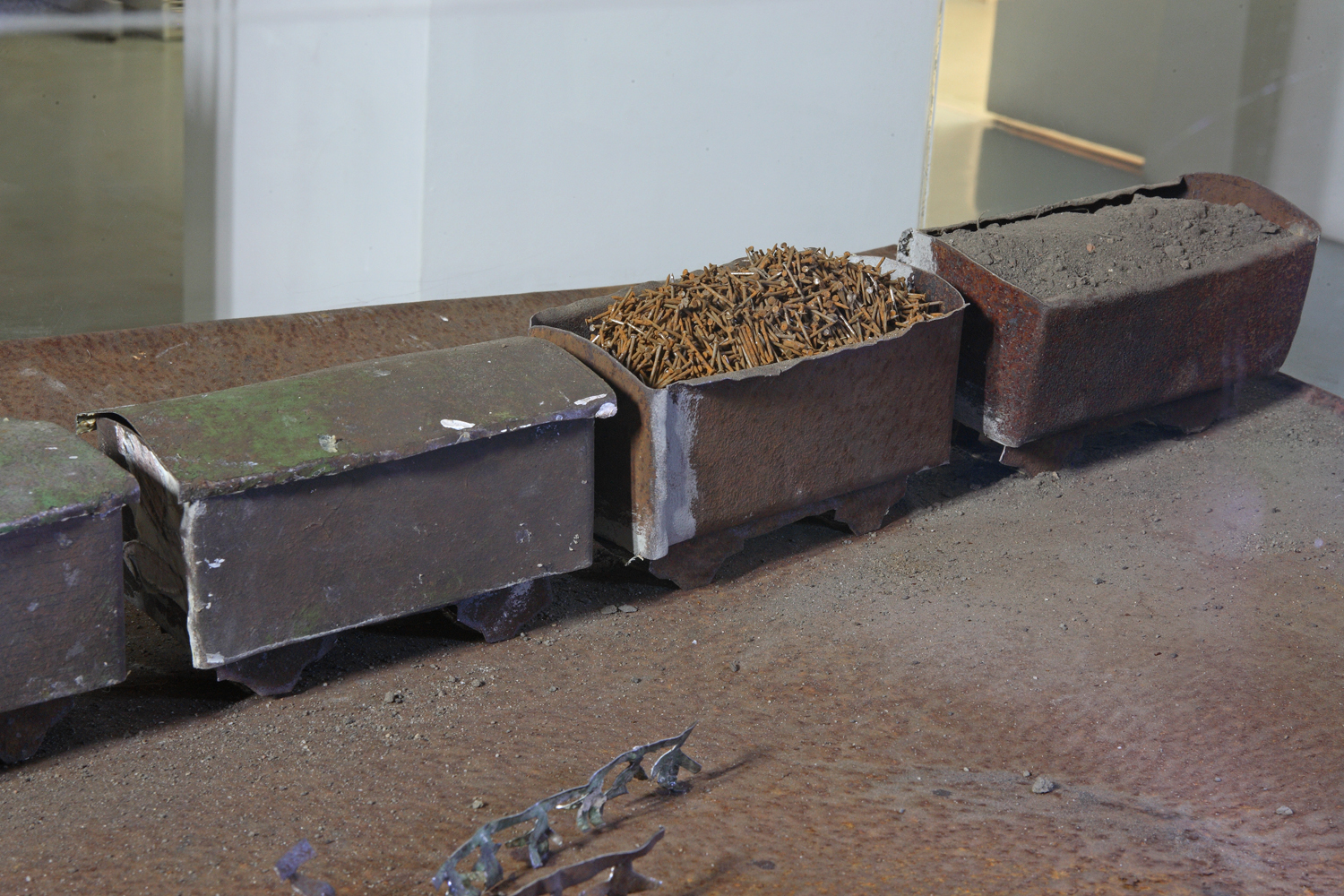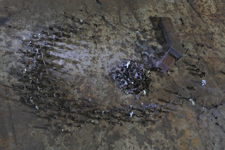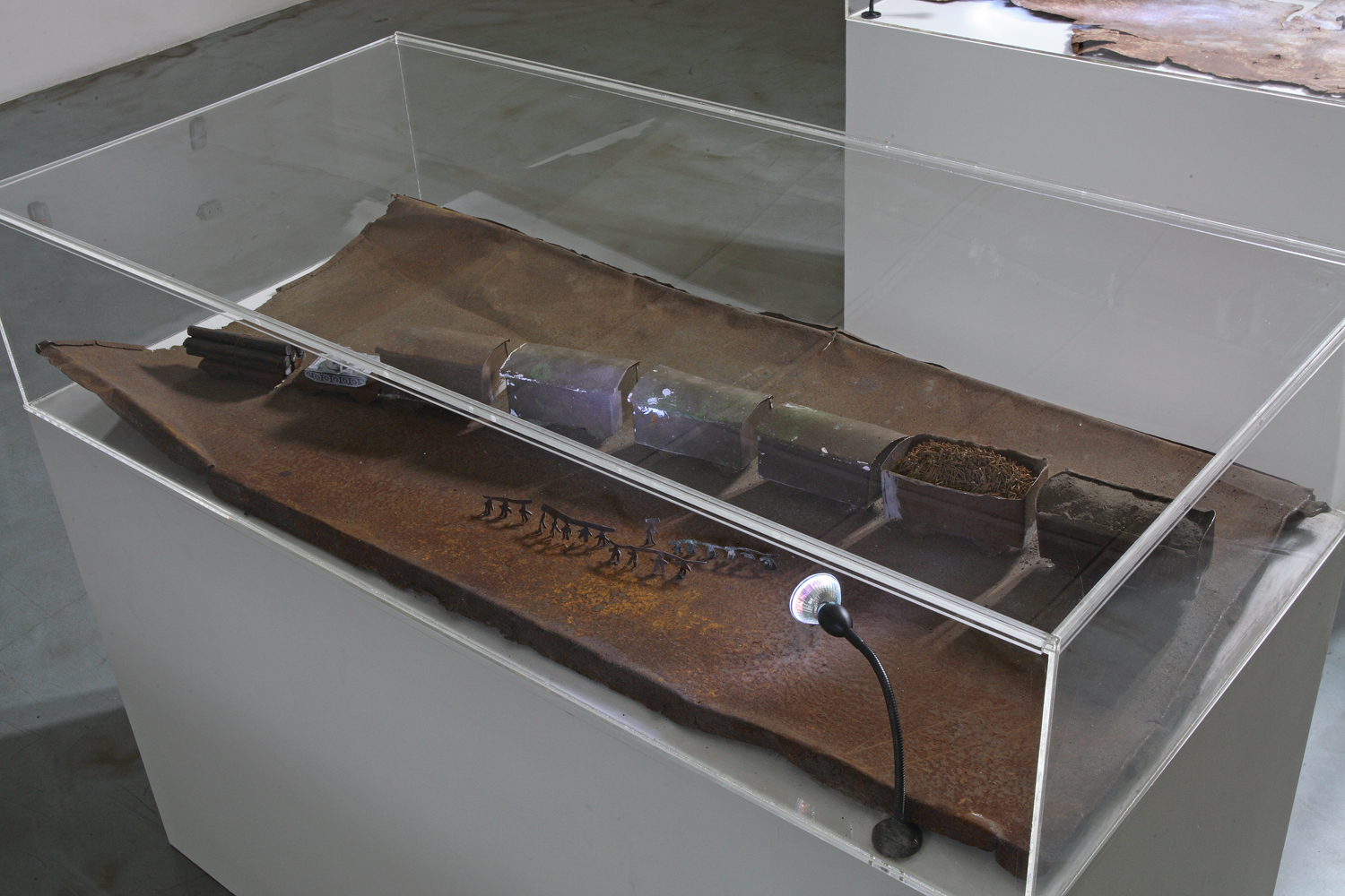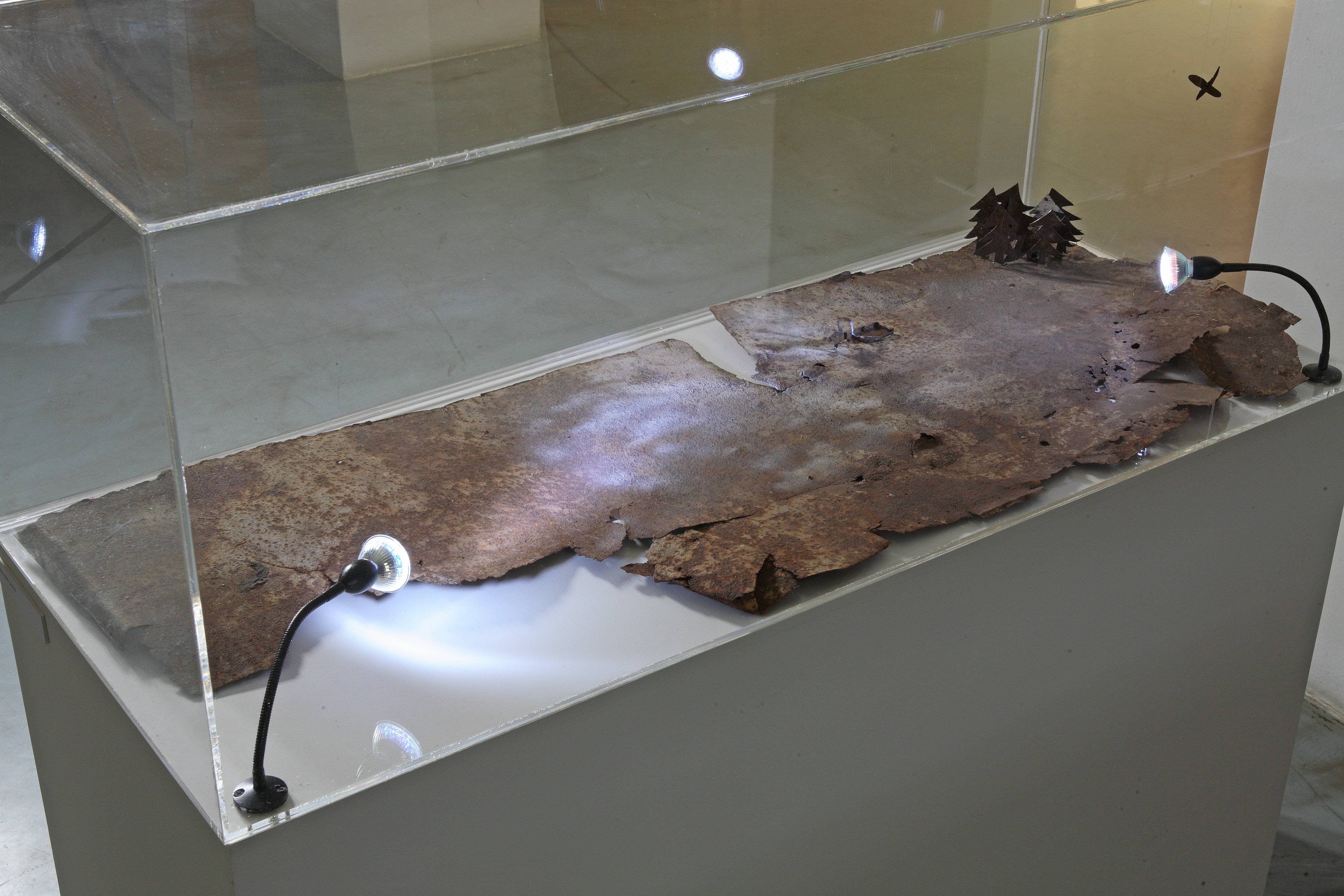 Sokol’s series “God Knows Where” consists of a set of “mock-ups” that represent fragments of the surface of the Earth, made out of rusty tin plate and contained within plastic boxes. The rust corrodes the metal, returning it into an element of the earth, whereas wretched little human figures, along with their houses and their goods and chattels are illuminated, as if at night, by the scanty light of electric bulbs fixed in the plastic “heavens”. This evening Earth is a sad thing to look at. Sad like memory that consistently loses details of the overall picture until it dissolves into nothing. Sad, too, like human history that is ultimately visible only to the archeologist that digs its particles out from the earth, in order to reconstruct fragments of the past and re-create it as mock-ups. However, unlike the archeologist who brings the past back into the present, Haim Sokol shows the past as past itself: as an unreachable geography and a weakening memory. His miserable “rusting earth” seems to be an auxiliary of both time and death that delete all traces — even the few that the second participant of the project hopes to preserve.