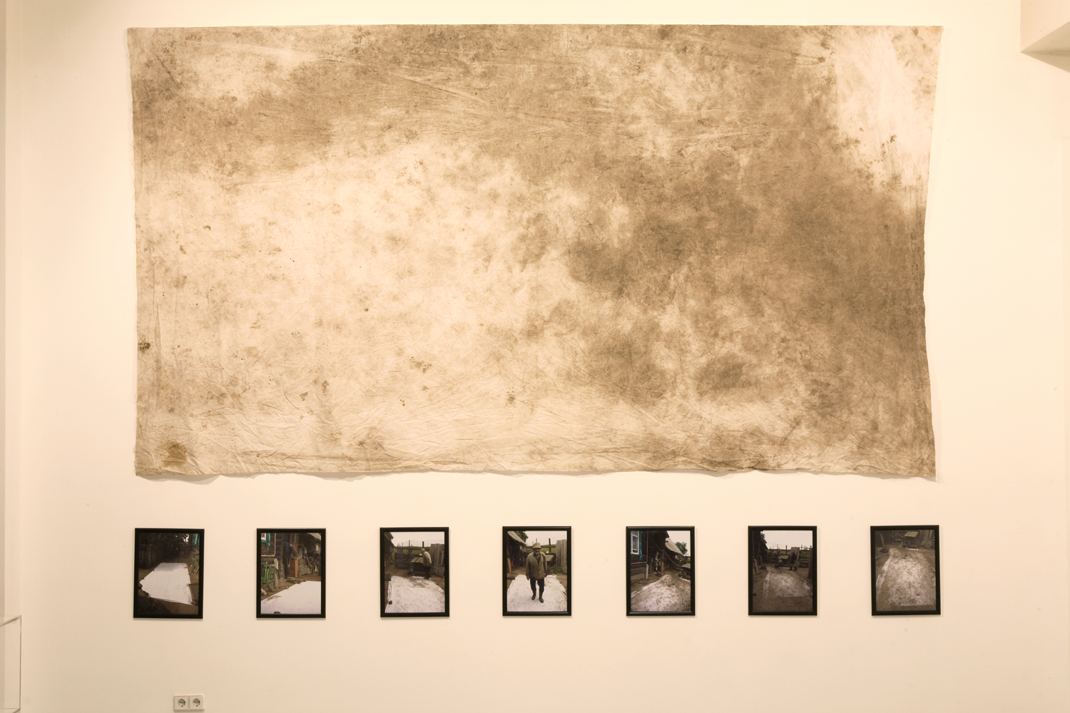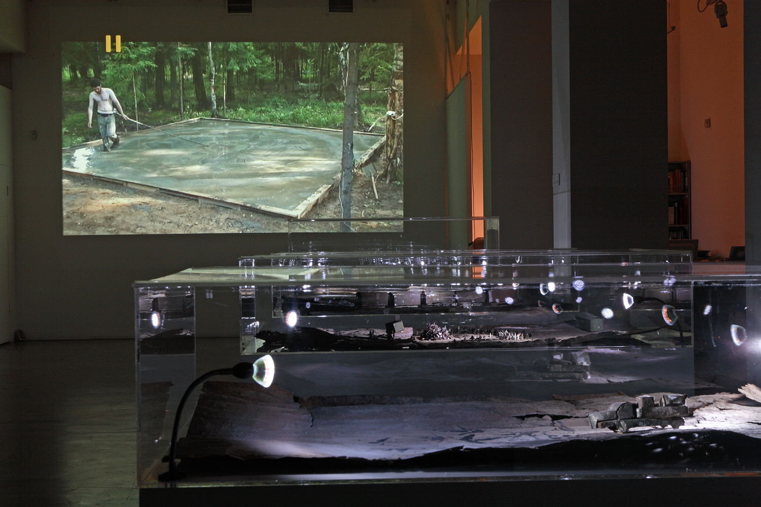 Andrey Kuzkin’s work for this Stella Art Foundation project are based on the documentation of his performances. In other words, they are, in and of themselves, a form of materialized memory. The first performance (“Traces”) took place in 2006 in the Pustyn village of the Ivanovo region, where the artist covered a part of the nearby yard with white cloth in such a way that the inhabitants had no choice but to make it dirty with their feet. So that now, two years later, his canvas, together with photographs of the people who had left their traces on it, has assumed the aspect of an altar of the cult of daily routine as it extends into eternity. The second performance (“Round and Round”), presented as a video projection, was organized last summer in the Veretyevo art-camp. Kuzkin circled around a platform that had just been covered with a fresh layer of concrete for as long as he was still capable of moving onward in the thickening mass. Amorphous matter eventually emerged victorious, but the hero had by then eternalized the trajectory of his motion in it.