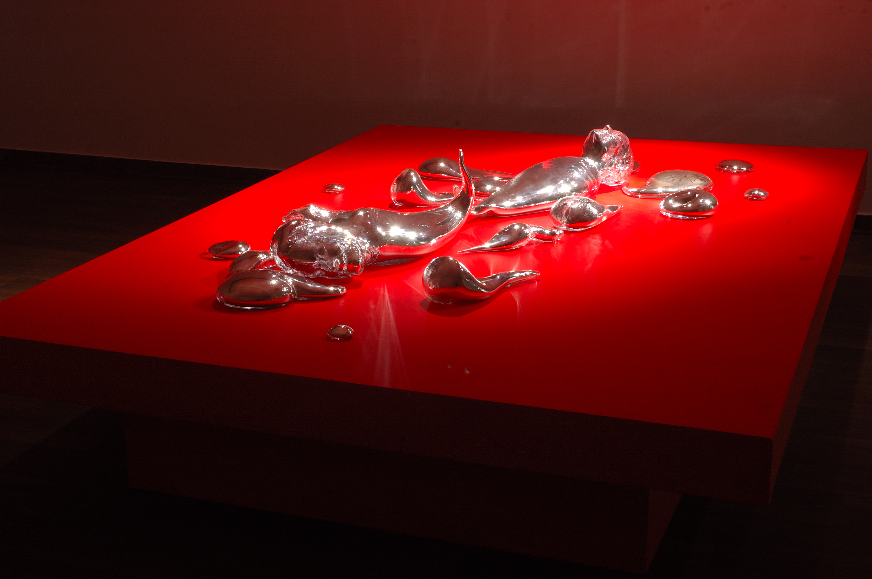 Mercury-flowing and condensing, anthropomorphous and drop-shaped forms embody various possibilities of human uprise from initial chaos of shapelessness, along with disappearance in it.