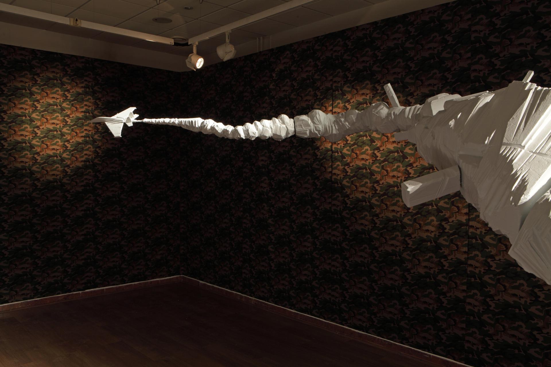 All this is contained in the title of the project. “Straight through” refers particularly to the main and largest object in the exhibition, with a bold summons to drive on upwards into the sky. But ‘Straight through’ also has a passive sense — “done to”, not “doing” — when it refers to a wound that brings complete and final defeat.
