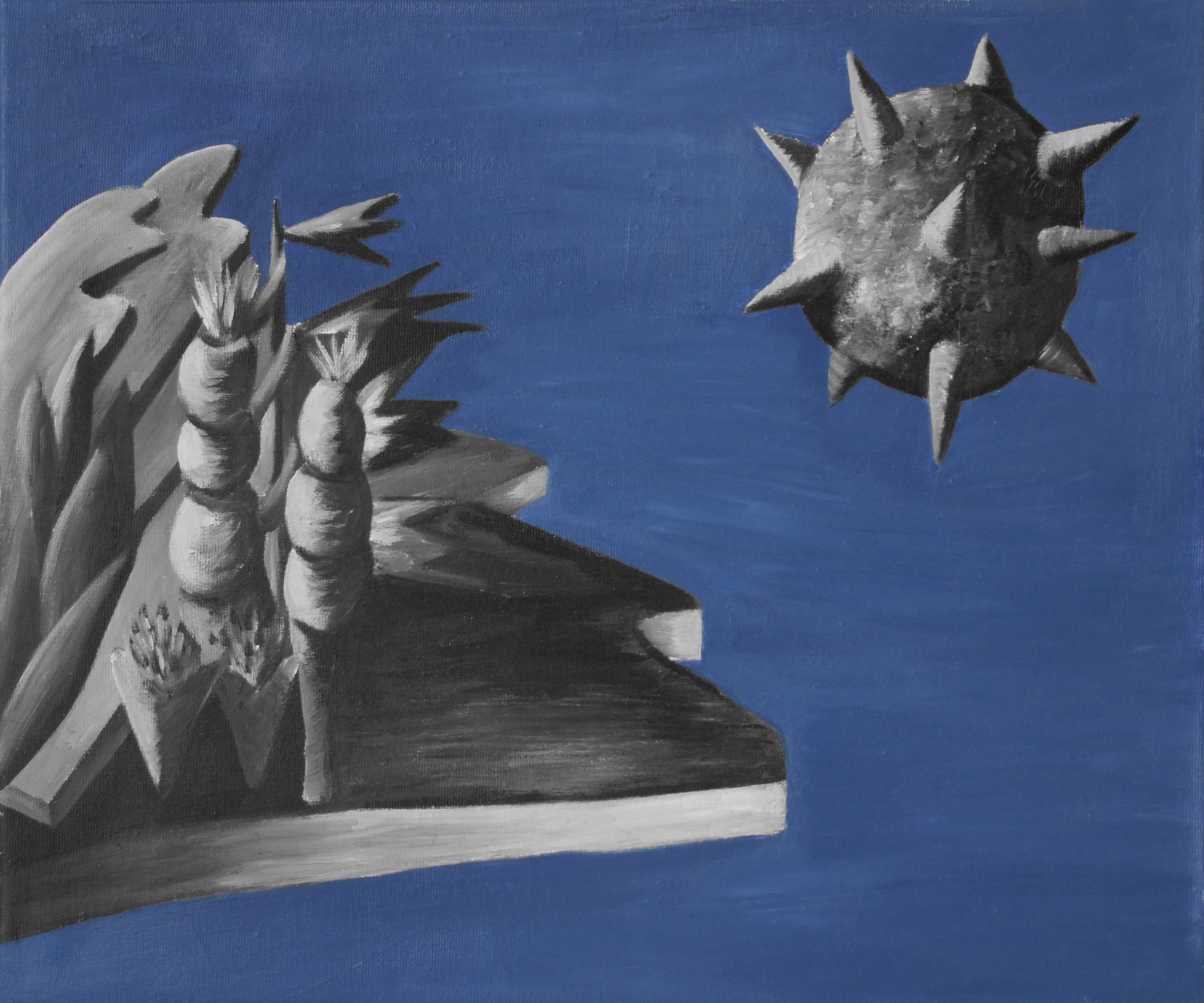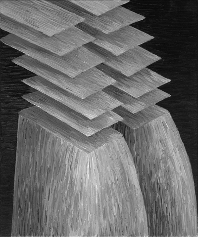 In the process of the perception of her paintings, the view of the spectator becomes a subject matter as well: it turns to its own possibilities, while the perceived paintings recede more and more to the background, dissolving as an object of contemplation. The resulting “interflow” between them is repeated in the set of objects shown on the canvases. Geometrical shapes are set against fluid ones. Forms appearing at the first glance to be solid, end up at the mercy of the flux. It looks like something flows out of them, gives them an impulse and sets them into motion. In this way the artist creates a fragile equilibrium between different aggregate states, which are presented before the viewers as a transition of liquid into solid and of perspective-based logical things into things illogical.