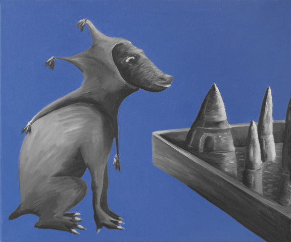 The projection and the perspective have been evolving in close relationship with the projection equipment, such as camera obscura, and so, to a considerable degree, they have been a basis of the “vision” typical of the present-day European since the Renaissance period at least. The space of the projection is not only an illusory space of the painted world beyond the canvas; it is also a necessary precondition for the possibility of the vision itself. There are psychological aspects to it as well. The central perspective relates to the eye just as a painting relates to an image of the pinhole camera. Maybe, with her works Beatrix Sunkovsky offers a sort of an ironic commentary to this “one-eye optics”. A closer look reveals that the geometrical shapes appearing on her paintings challenge the very logic of this perspective-based view. 3D images unexpectedly melt into planes, an edge of a flat object becomes an entrance into a kind of a well. Thus, the very laws of picture composition are violated over and over again.