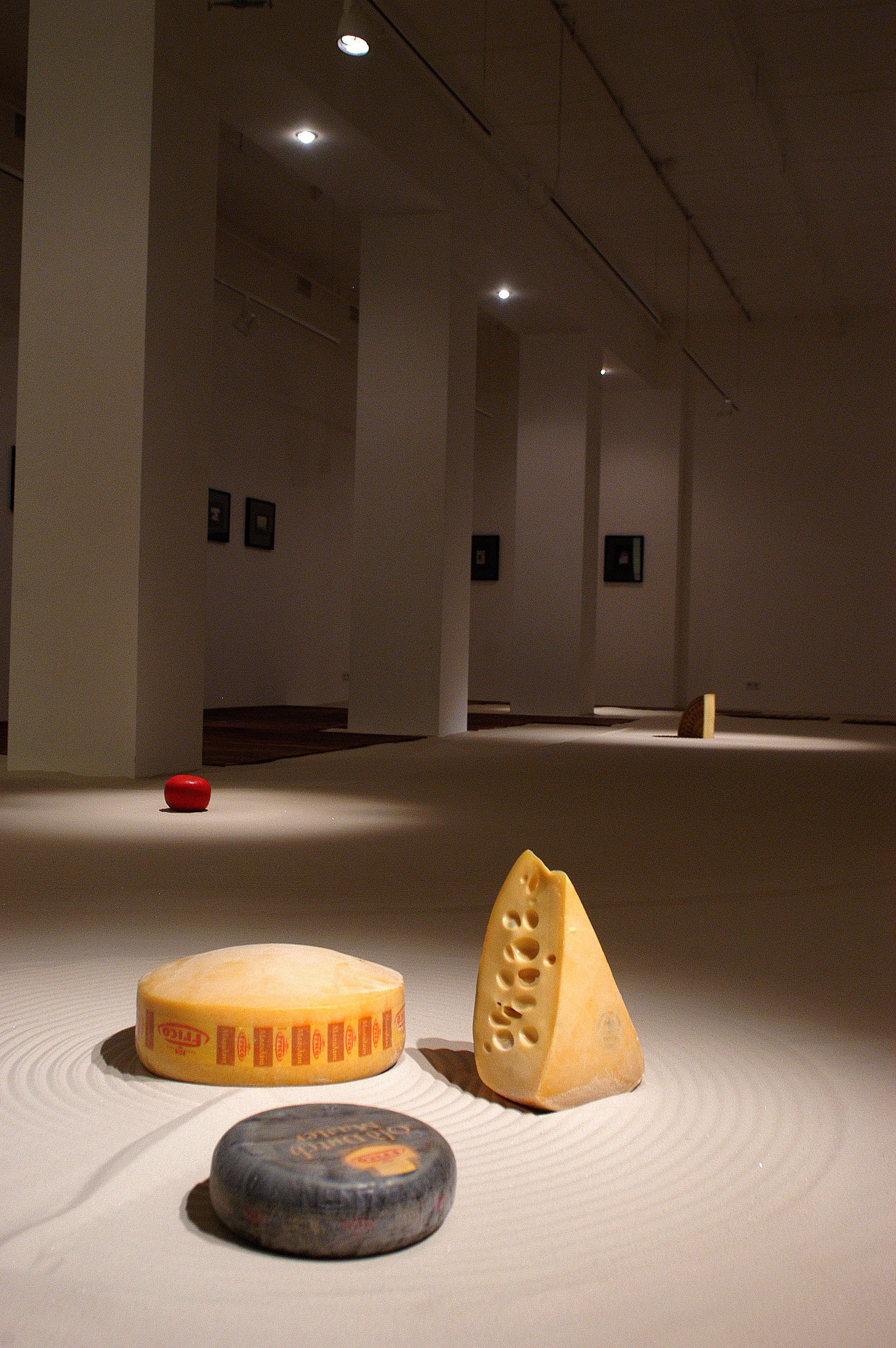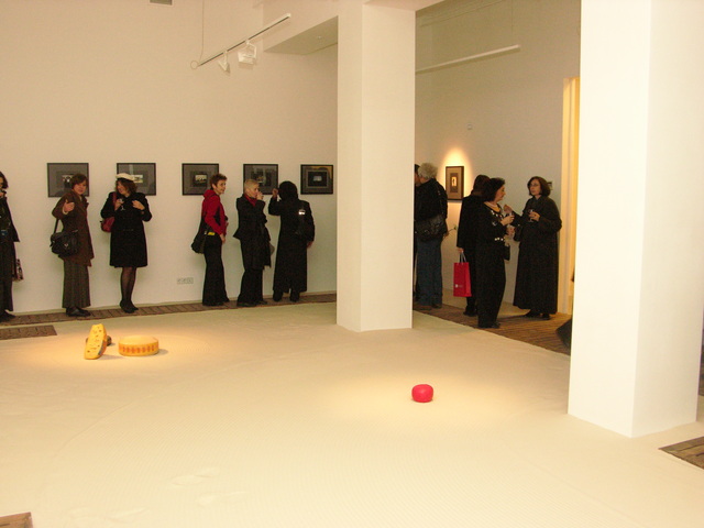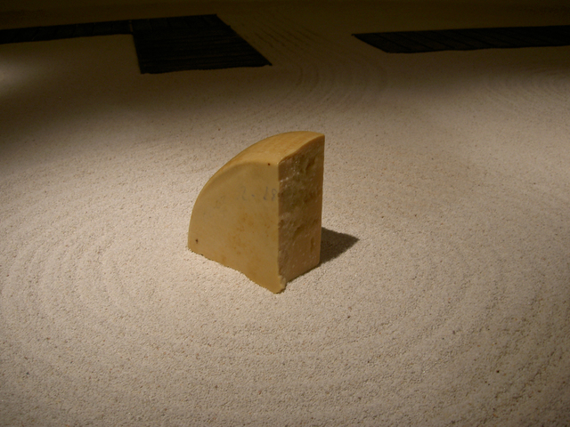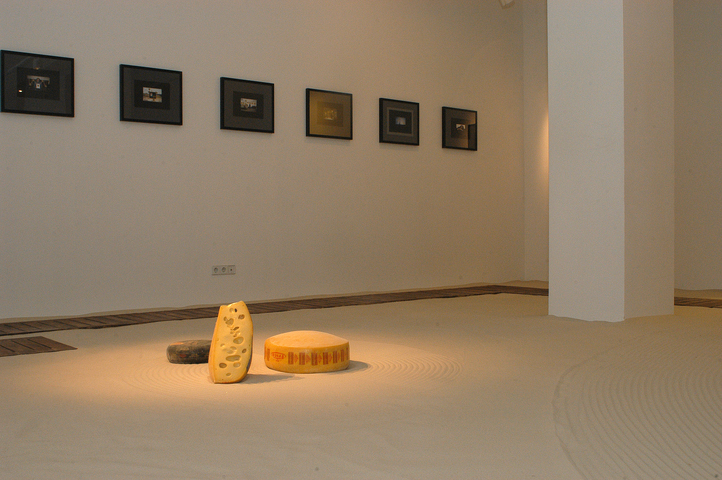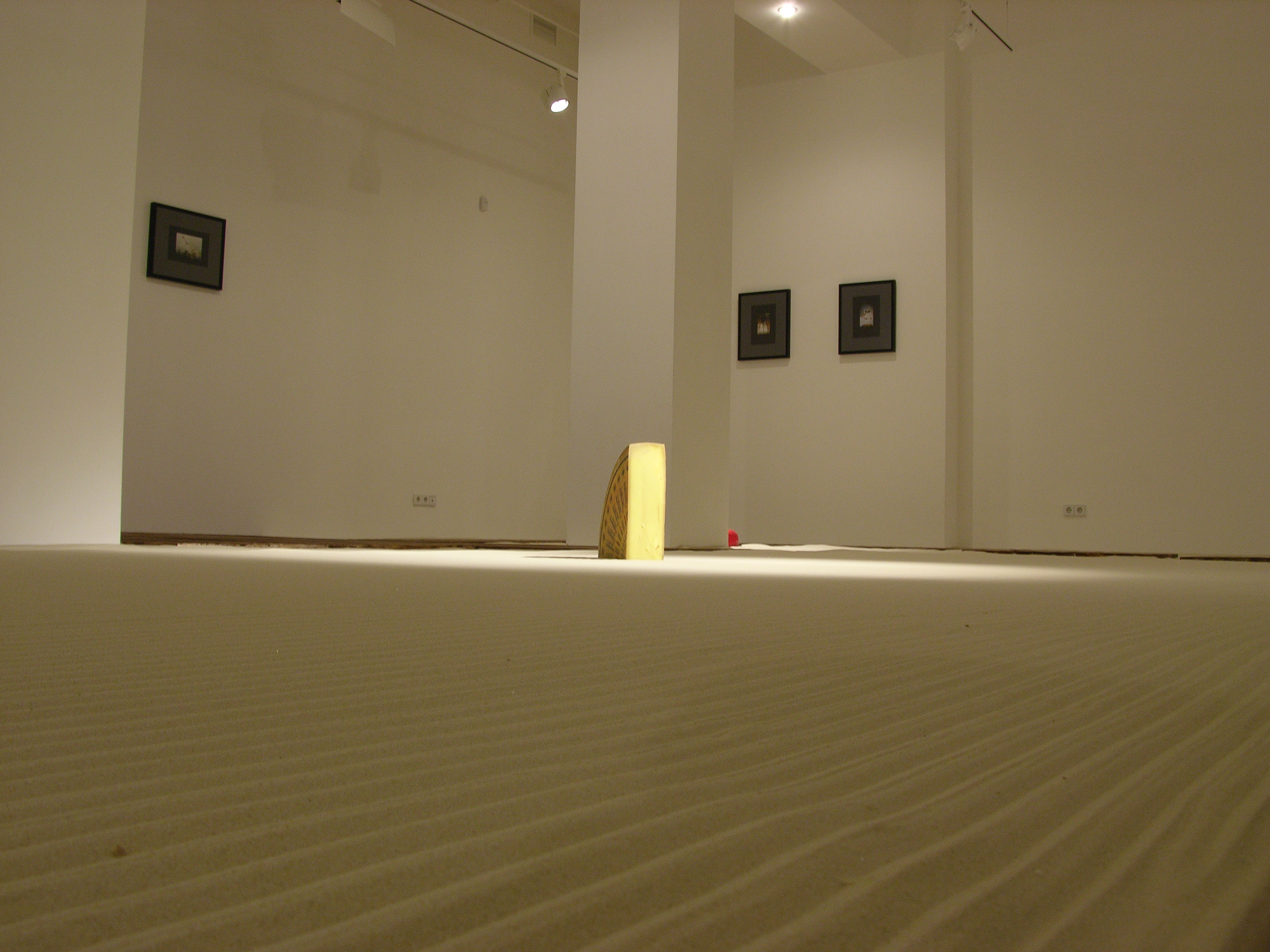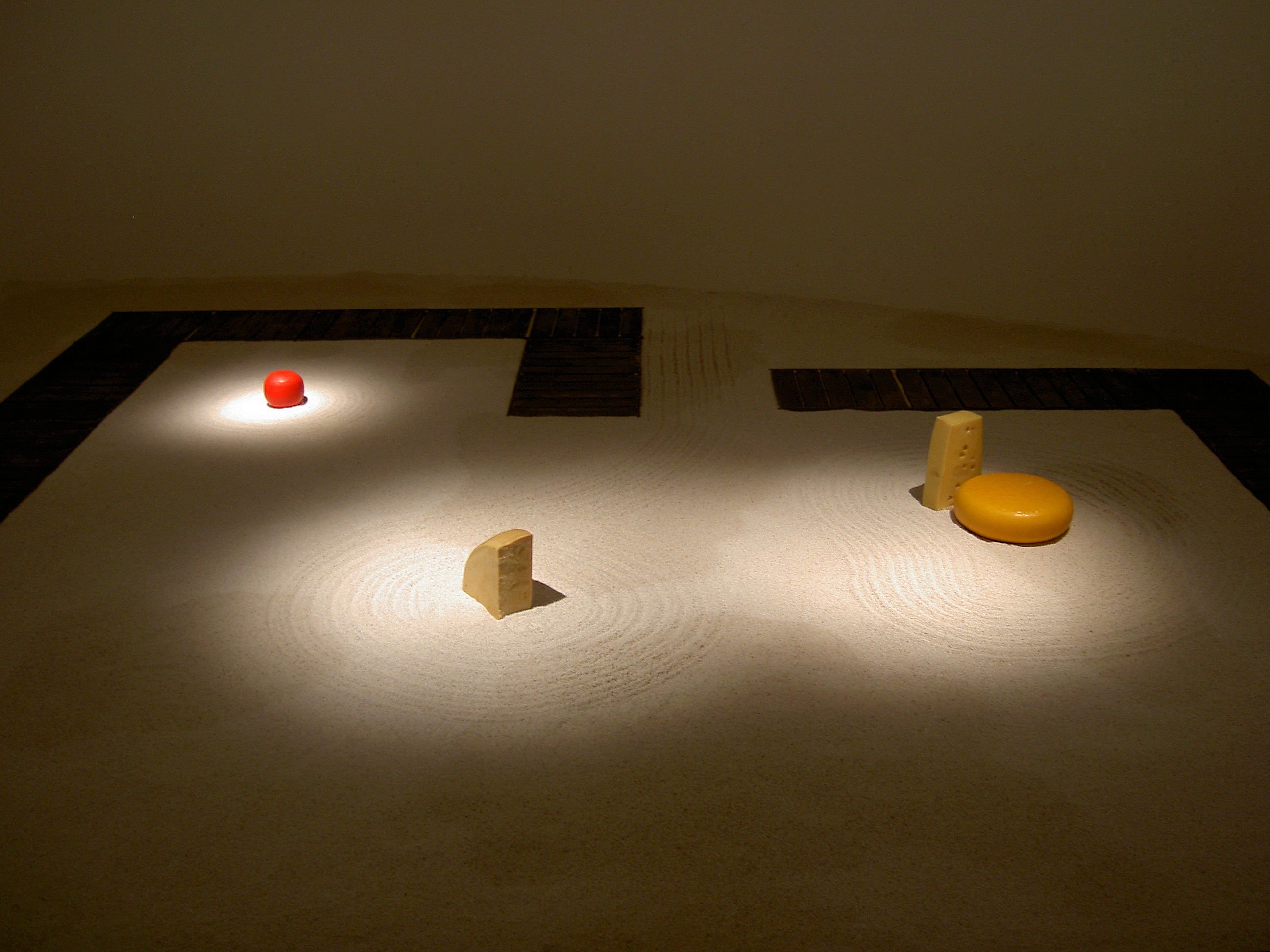 Vadim Zakharov on the project: “My installation is based on a story of a mouse I once thought of. Once upon a time, a very long time ago, a mouse found its way into an old monk’s bowl lured by a huge piece of French cheese with inimitable, heavenlike smell. The monk saw the mouse, smiled, scratched its ear and said: “Well, I give you this piece of cheese as a gift forever. Put in on the sandy floor of our monastery garden and keep it safe as your own precious self. Because if you eat this piece which is many times your size, you are going to turn into an elephant and die.” The mouse didn’t eat a single crumb of it since then. The very next day, the old monk disappeared from the monastery never to be seen again, while the mouse still lives and is going to live so long as the untouched piece of cheese lies on the sand.