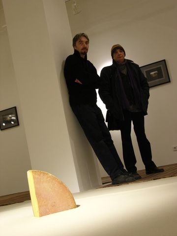 Andrei Monastyrski on the project: “In the Odes of Wei section of the ancient Chinese book Shi Jing there is a poem called Large Mouse. Its refrain goes like this: “Large mouse! Large mouse! Do not eat our springing grain!” The “large mouse” which appears for the first time in this old verse (symbolizing an exploiter and blood-sucker, among other things) has subsequently become a classical literary “character”. In some sense, it is this mouse which is also the real central figure of our exhibition “Hunting the Mouse” — at least, it is clear from the exhibition’s title and the context it creates. The cheese in Vadim Zakharov’s installation serves as a sort of a bait for this mouse, while my three owls under a gauntlet from the Golden Lines series and the image of an eagle’s (or it could be falcon’s or hawk’s) head on a truck on the Biokombinat sheet of the same series are, in effect, the actual hunters of this mystical gigantic mouse”.