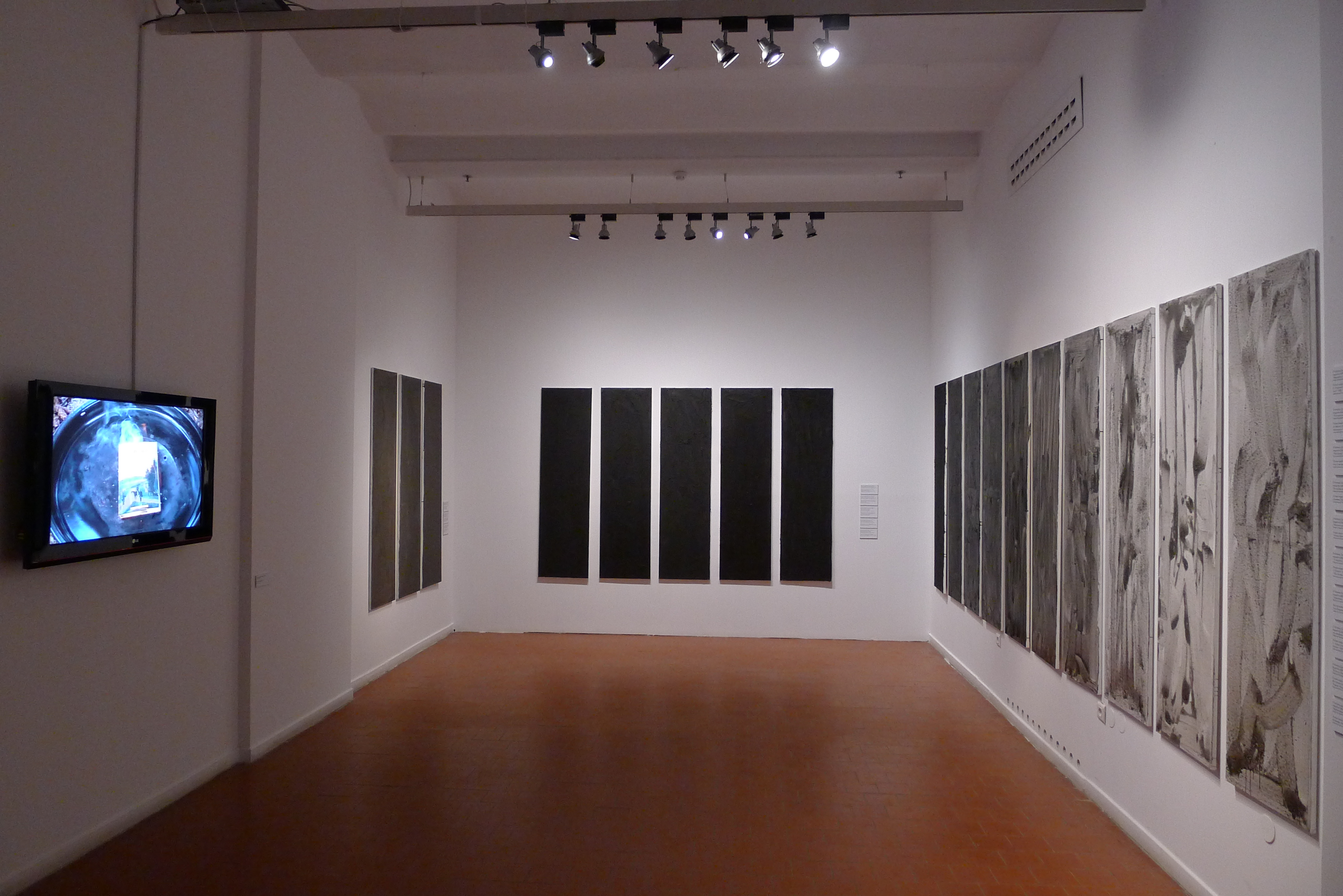 Yuri Albert is exhibiting works from two of his projects. One of them consists of monochrome abstract canvases (each the same size as the author’s body, height-wise and across the shoulders) painted in the ash of burnt books from his personal library (My favourite books). The second is a running line of writing that reproduces a work by Philostrates the Elder (170–247 A.D.) where he describes works of art from antiquity that are long lost and may never have existed (The Pictures). Together they form an apparatus of circular pursuit, an endless transmutation of assimilated (loved) texts and alienated visual objects. Or, put differently, they are a secular-aesthetic analogue of the philosophical elixir, which can function at once in two modes — personal transformation (a body-size picture) and the conversion of words and things.
