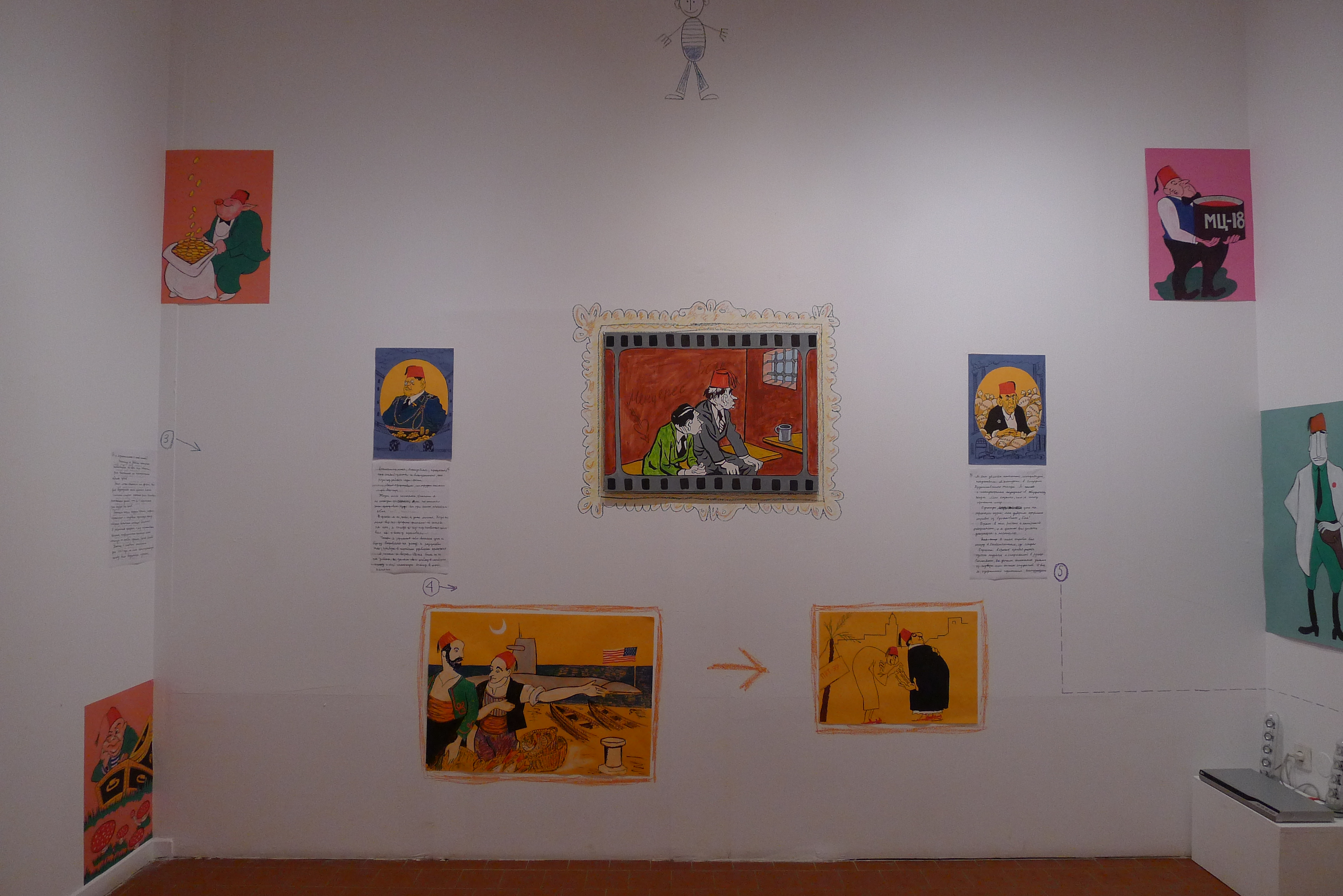 Konstantin Zvezdochetov has created a wall installation for the exhibition, entitled Adventures of the Fez. It consists of a large number of graphic and artistic representations of subjects wearing fezes, connected with one another by various lines and arrows. As the wittiest story teller among the conceptualists Zvezdochetov knows that an absorbing narrative — whether oral, written or in pictures — is its own “smart machine”, and he frugally limits himself to an illustrative-graphic construction. The construction is certainly reminiscent of a traditional family tree but, more than anything, it is a generalized and exemplary text book from the Communist era with its inspirational-bureaucratic formalism, but with a single and decisive difference. Zvezdochetov’s representational pallet comes directly from caricature: he borrows his visual style from the illustrators of Crocodile, the satirical magazine beloved of many generations of people in the Soviet Union. Adventures of the Fez is not merely a visual caricature: the cheerful absurdity penetrates the very structure of the installation, so that all of its connections have a formal, grotesquely simulative character. The mechanism works unfailingly and its only product is the silent “rustle of language” described by Roland Barthes — the pure matter of aesthetic pleasure.