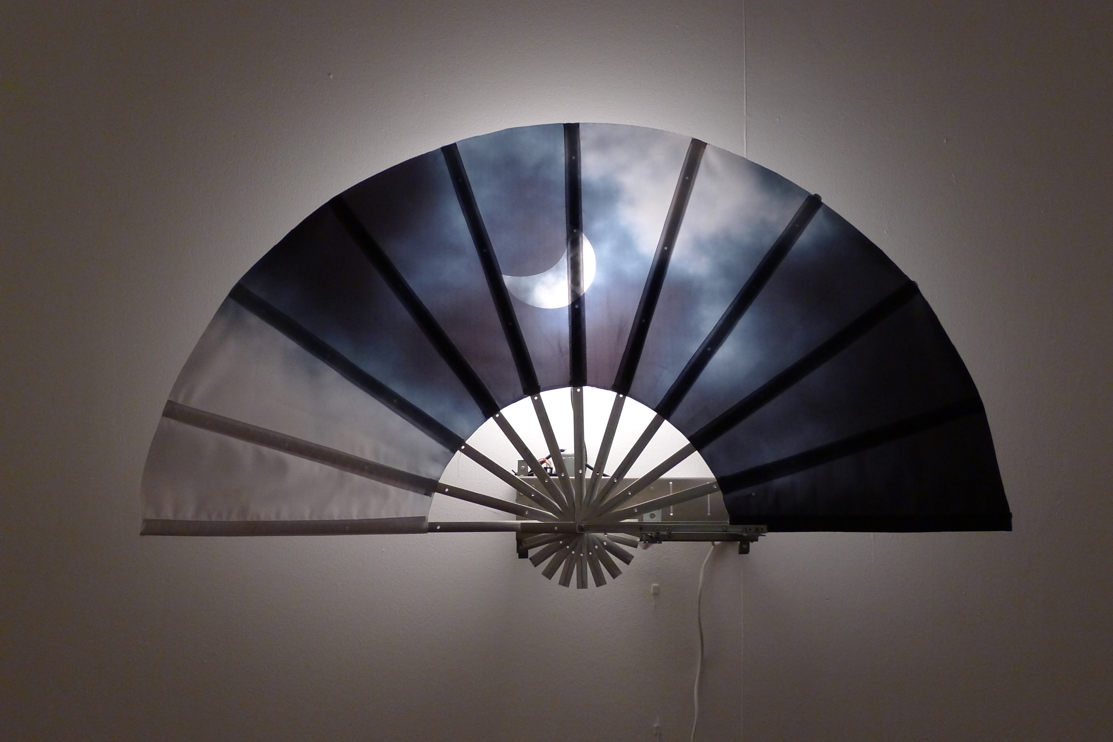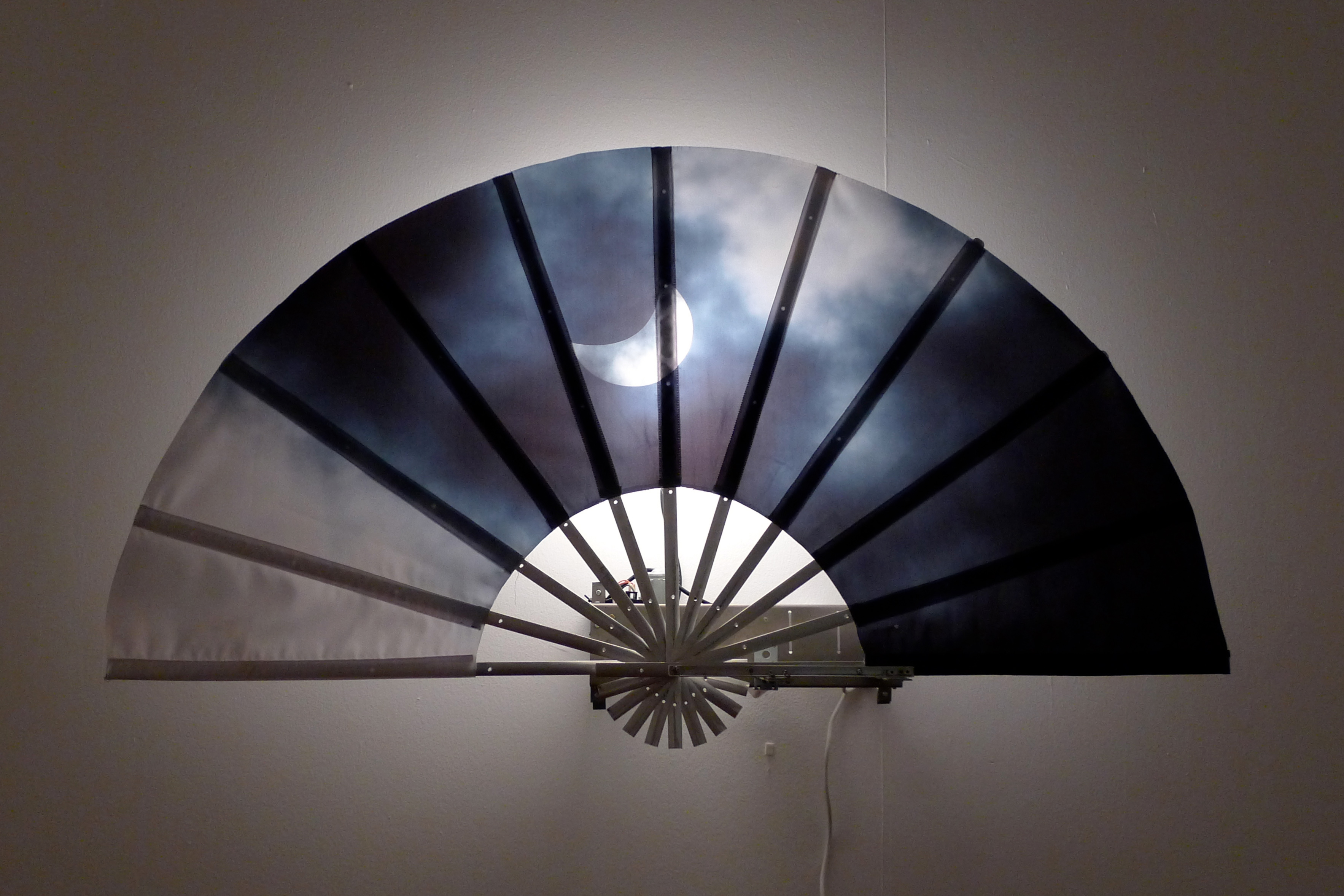 Andrei Filippov has built an installation for the exhibition consisting of dynamic objects with the title Rolling Blackout (the Russian term translates literally as “fanlike power cut”). In this case we literally have a machine, a genuine mechanical construction: large fans with a representation of the sky, which are opened and closed by electric motors. A rolling blackout is a complete or partial shutdown of power supply for technical reasons. But for Filippov the shutdown is associated directly with the end of the world in its Judaeo-Christian version, or, more precisely, with one of the events of global culmination, in which “the heaven departed as a scroll when it is rolled together” (Book of Revelation, 6:14) or when “the heavens shall be rolled together as a scroll” (Book of Isaiah, 34:4). The biblical comparison of the heavens with a scroll is transformed by the artist into a coincidence of scroll and heavens or, rather, he swaps the scroll for a fan, which he presents as a book-map of the heavens. Picture, book, scroll and fan are for Filippov invariants of a single thought-form, whose historical origins are to be sought, not in the European tradition, but in the Eastern, and more specifically the Chinese tradition, where scroll, fan and screen have long served both for the inscription of texts (essentially, as alternative book formats) and as a support for painting, and this is perfectly natural, since writing and representation in Chinese culture grew from a common root and were therefore easily united. If we then remember that Chinese culture has always been important for the Moscow conceptualists and that they felt a certain kinship with the thinkers-literati-artists of ancient China, the logic of creation of Rolling Blackout becomes clearer still.