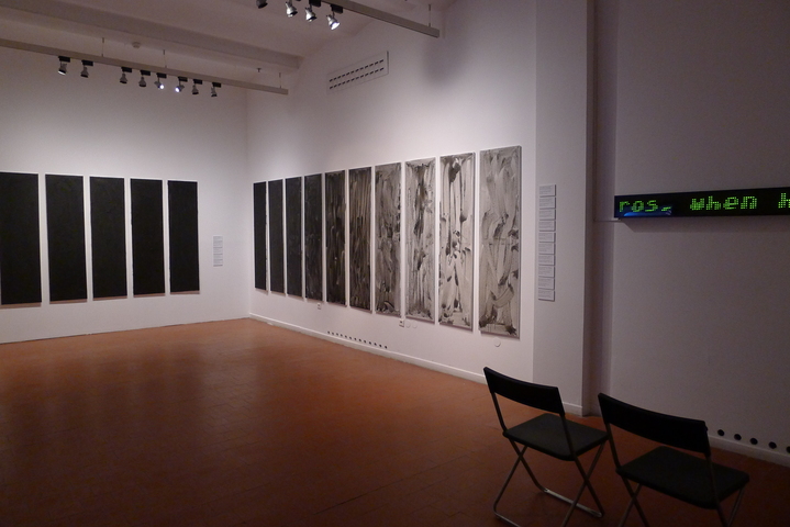 Yuri Albert is exhibiting works from two of his projects. One of them consists of monochrome abstract canvases (each the same size as the author’s body, height-wise and across the shoulders) painted in the ash of burnt books from his personal library (My favourite books). The second is a running line of writing that reproduces a work by Philostrates the Elder (170–247 A.D.) where he describes works of art from antiquity that are long lost and may never have existed (The Pictures). Together they form an apparatus of circular pursuit, an endless transmutation of assimilated (loved) texts and alienated visual objects. Or, put differently, they are a secular-aesthetic analogue of the philosophical elixir, which can function at once in two modes — personal transformation (a body-size picture) and the conversion of words and things.