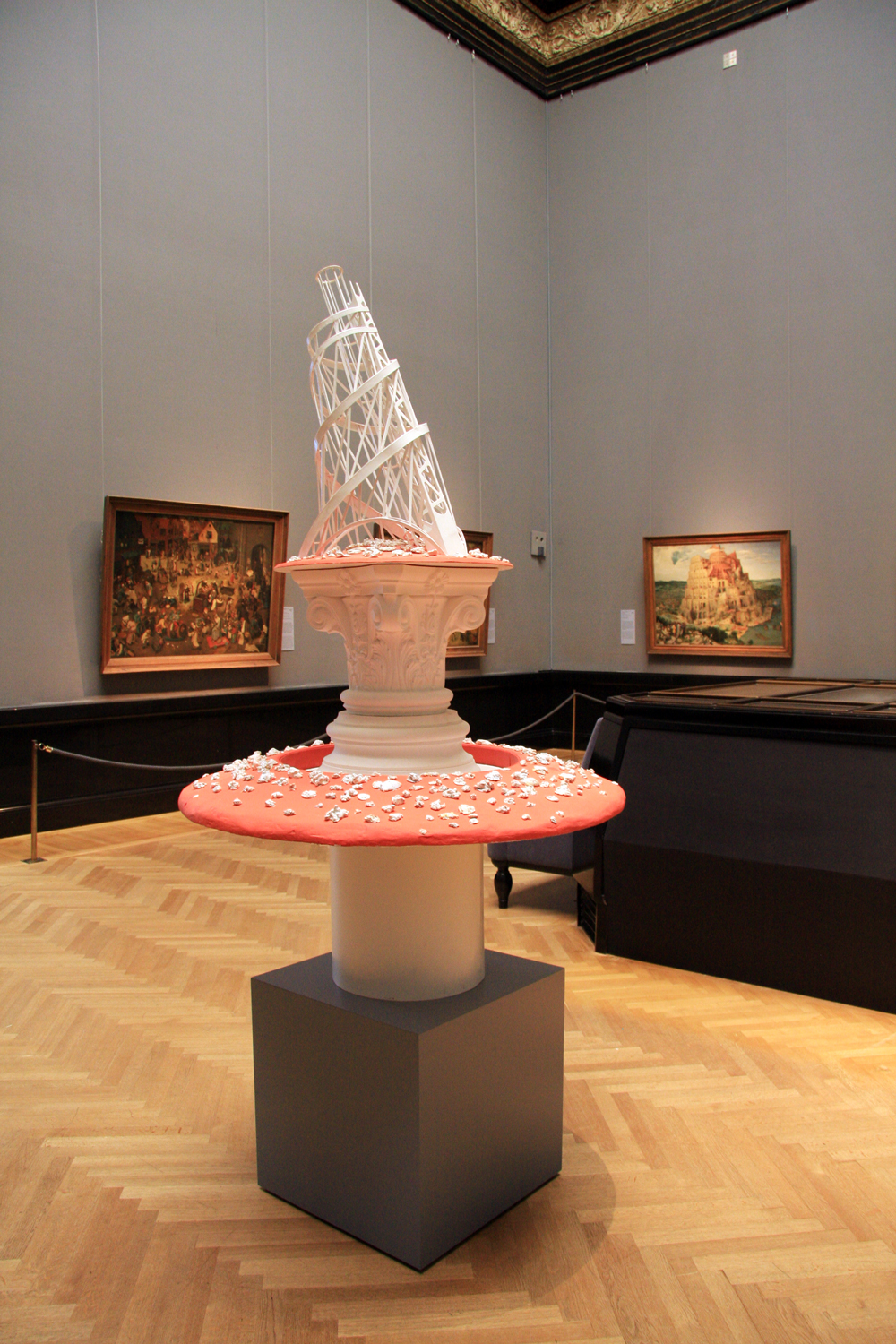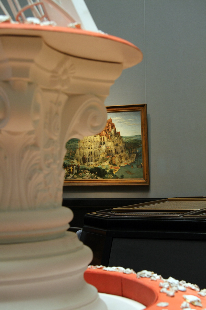 The exhibition in the KHM in Vienna will establish a multi layered approach of the two artists towards the collections of this museum. The spaces will not be used as “white cubes” — which means places where the art of the two artists will be shown. The halls will not be emptied. The artists fit in their works in the emptieness between the already presented objects of art. At the same time commeningt and completing the already existing iconological concept of the museum. One part will react directly to single artworks as the “Tower of Babel” by Breugel. Another part will parallelize the developement of the artistic personality shown by Dürer to their own liberation from the traditional concept of art and artworks. The last part will reflect the concept of the “cabinet” one of which is also part of the collections of the KHM.