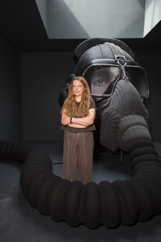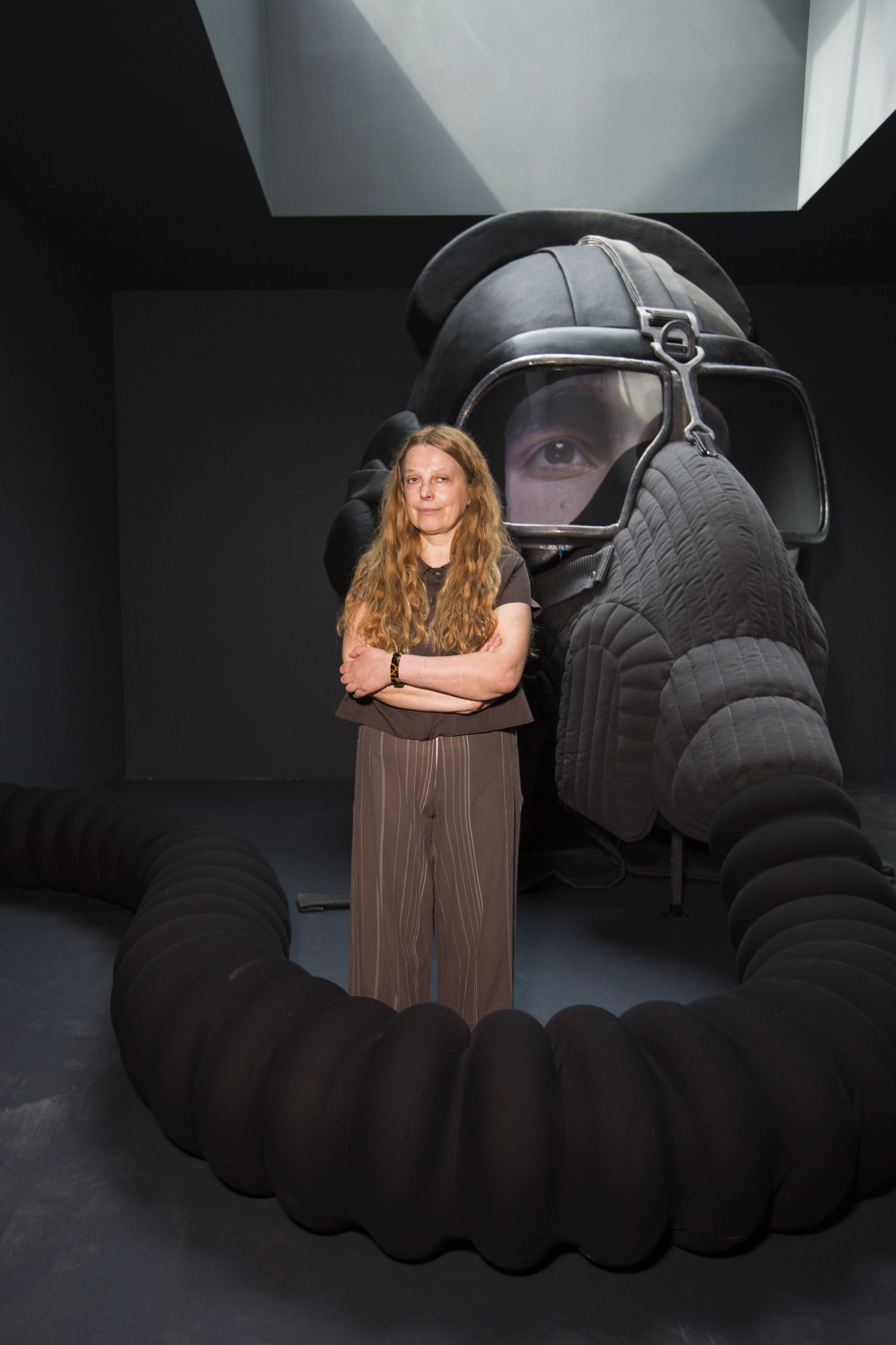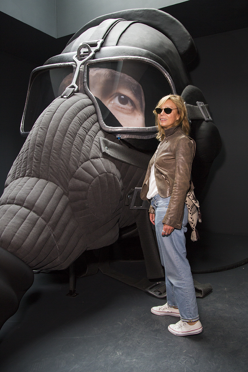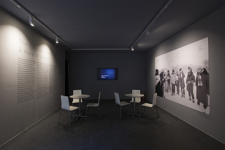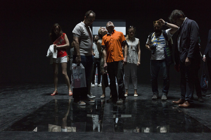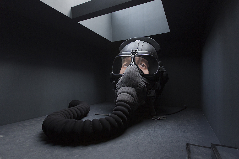Inside the Green Pavilion, Nakhova further underscores the signifying mechanisms of color by painting every room a different hue. Shchusev’s division of the Russian Pavilion into five discrete spaces prompted Nakhova to revisit her 1980s Rooms series, where the viewer was actively involved in an artistic experiment. In the first room on the pavilion’s main floor, Nakhova projects herself onto the futuristic image of a pilot in the form of a head. The oversized head’s impenetrability (achieved by means of a helmet, mask, and goggles), combined with the proposition that the viewer seek to control his perceptions, reveals the duality of the artist’s position in society. On the one hand, he is authoritative, while on the other he is too dependent on the external world from which he aims to escape and simultaneously wishes to control. In the second room of the installation, Nakhova tackles Kazimir Malevich’s Black Square, the most enigmatic canvas in the history of modernism, a work entirely reliant on the viewer’s imagination as it provides neither formal nor iconographic referents. Depending on one’s position in Nakhova’s installation, the square appears opaque, creating the effect of a solar eclipse, or transparent, as if joined to the cosmos, observable through the skylight above.