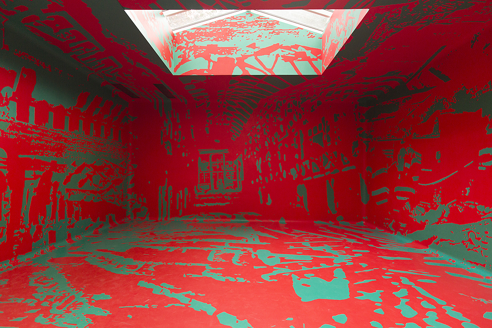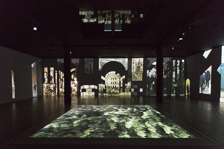 In the third space, Nakhova’s painterly gifts expand beyond the boundaries of the picture frame, filling up the entire space with an abstract composition executed in two of the most significant colors in the history of Russian art: revolutionary red and perestroika green. The characteristics of these two epochs of Russia’s history are thus communicated exclusively through the use of color and form, reminding the viewer of the social aspirations of abstract art. For the ground floor of the pavilion, Nakhova created a video installation consisting of the grids of digital re-creations of architectural modules drawn from Shchusev’s iconic monuments, such as the Lenin Mausoleum; these modules are filled with private and public archival photographs. Nakhova destabilizes this factographic architectonics by the insertion of images of abjection such as worms, and by a confluence of elements that together allegorize the vulnerability and instability of historical assertions.