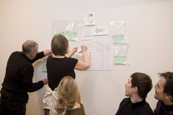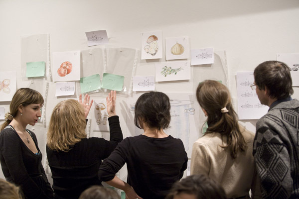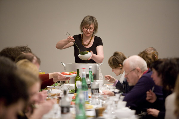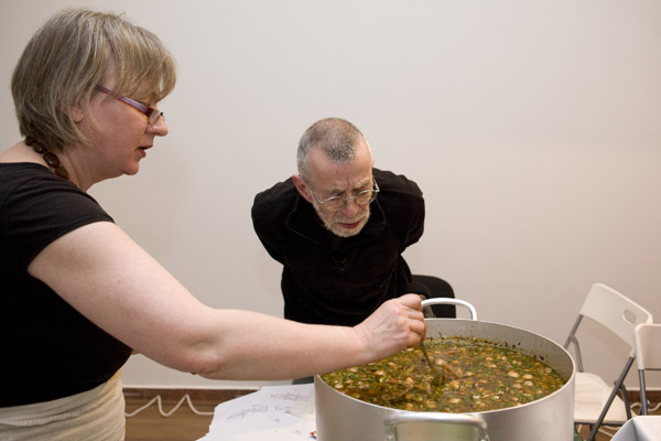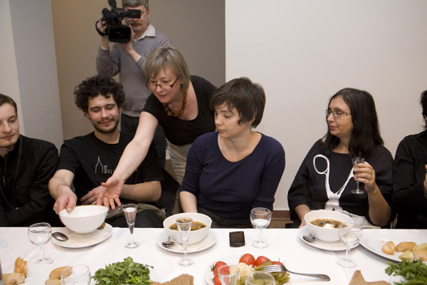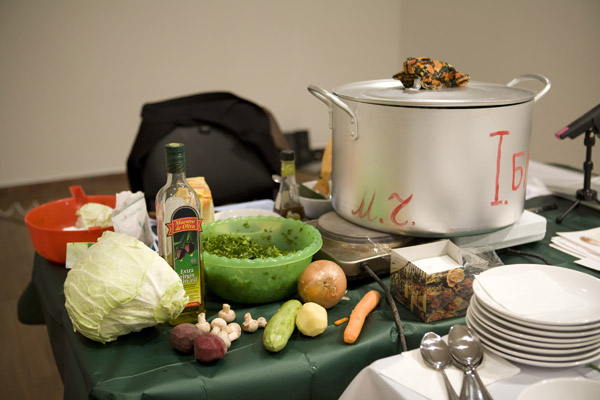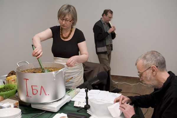That’s what we did. As part of her trademark “kitchen” strategy, Masha cooked spaghetti, and the spirit of cooking, as strong as it is eternally optimistic, temptingly wafted through the exhibition space. Sergei filled and organized the cooking time with his meditative music. I used various words, phrases, and sayings in my native tongue as if to let everyone know that everything happening there and then had a meaning, and that this meaning was worth the effort spent at least trying to understand and define it. It seems that this “action” struck a chord with the fairly decent number of people there. I can vouch firmly for the spaghetti, at the very least.